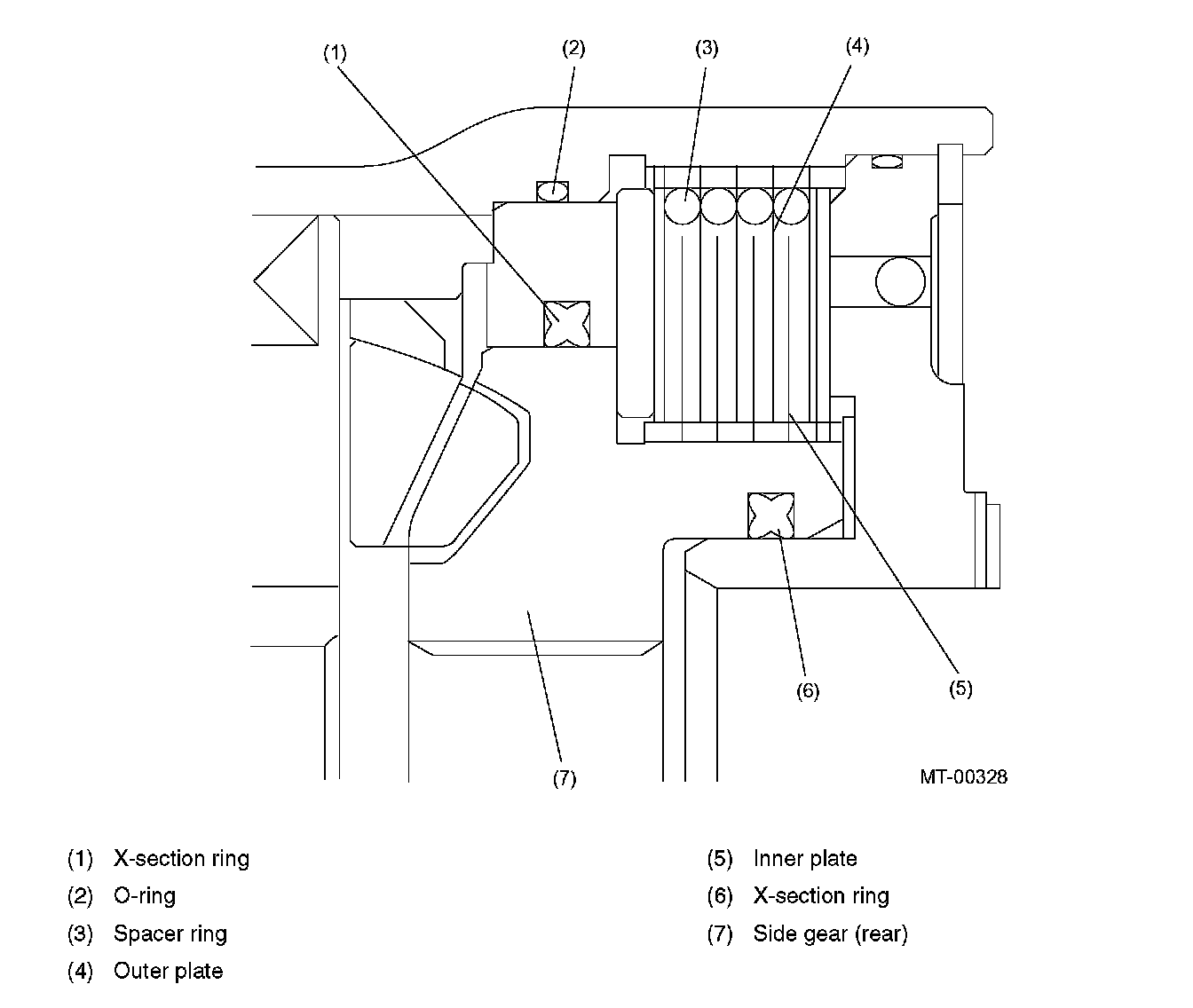 MECHANISM OF VISCOUS COUPLINGThe viscous coupling consists of a number of alternately arranged inner and outer plates and air- and-silicone oil mixture filled into a sealed space that is formed by the center differential case and the rear side gear of the differential gear set. The inner plates have their inner perimeters splined to the side gear and the outer plates have their outer perimeters splined to the center differential case. The outer plates are held apart by spacer rings. There are no spacer rings between the inner rings, so the inner rings are movable slightly in axial directions. X-section rings are used to prevent leakage of silicone oil, which would otherwise occur if the oil is pressurized due to large difference in front and rear axle speeds.