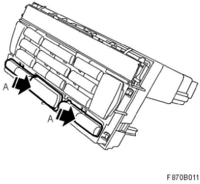 13. Fit the seat heating buttons, dummy buttons and the button for the hazard flashers. Make sure that the downward facing catches are aligned with the holes and carefully fit the buttons (A).