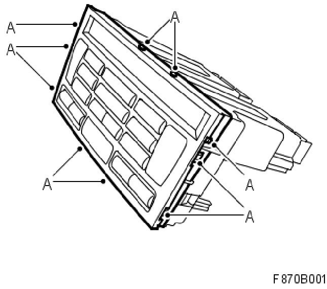 14. Place the front panel flat in front of the ACC unit as it is positioned in the car and carefully fit the panel with equal force. Make sure that all the catches mate correctly (A).