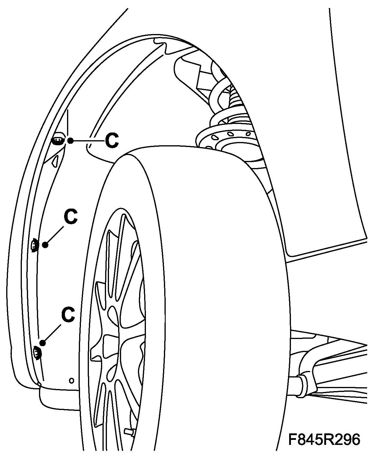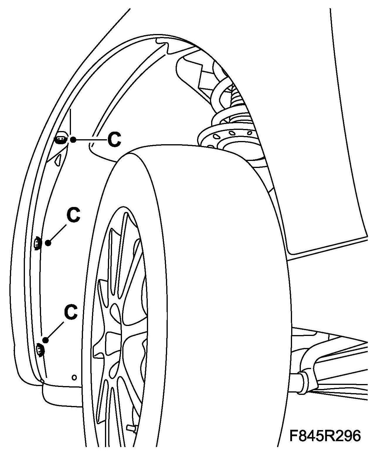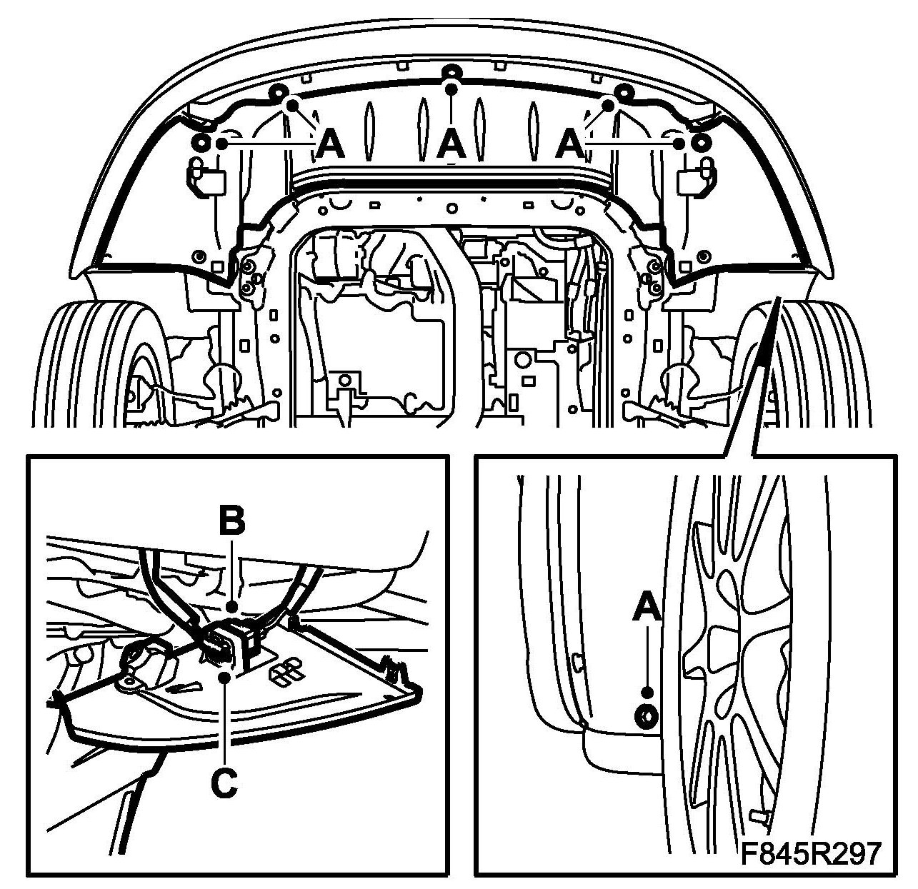 4. Remove the spoiler shield's bolts (A). Unplug the connector (B) and remove connector (C).