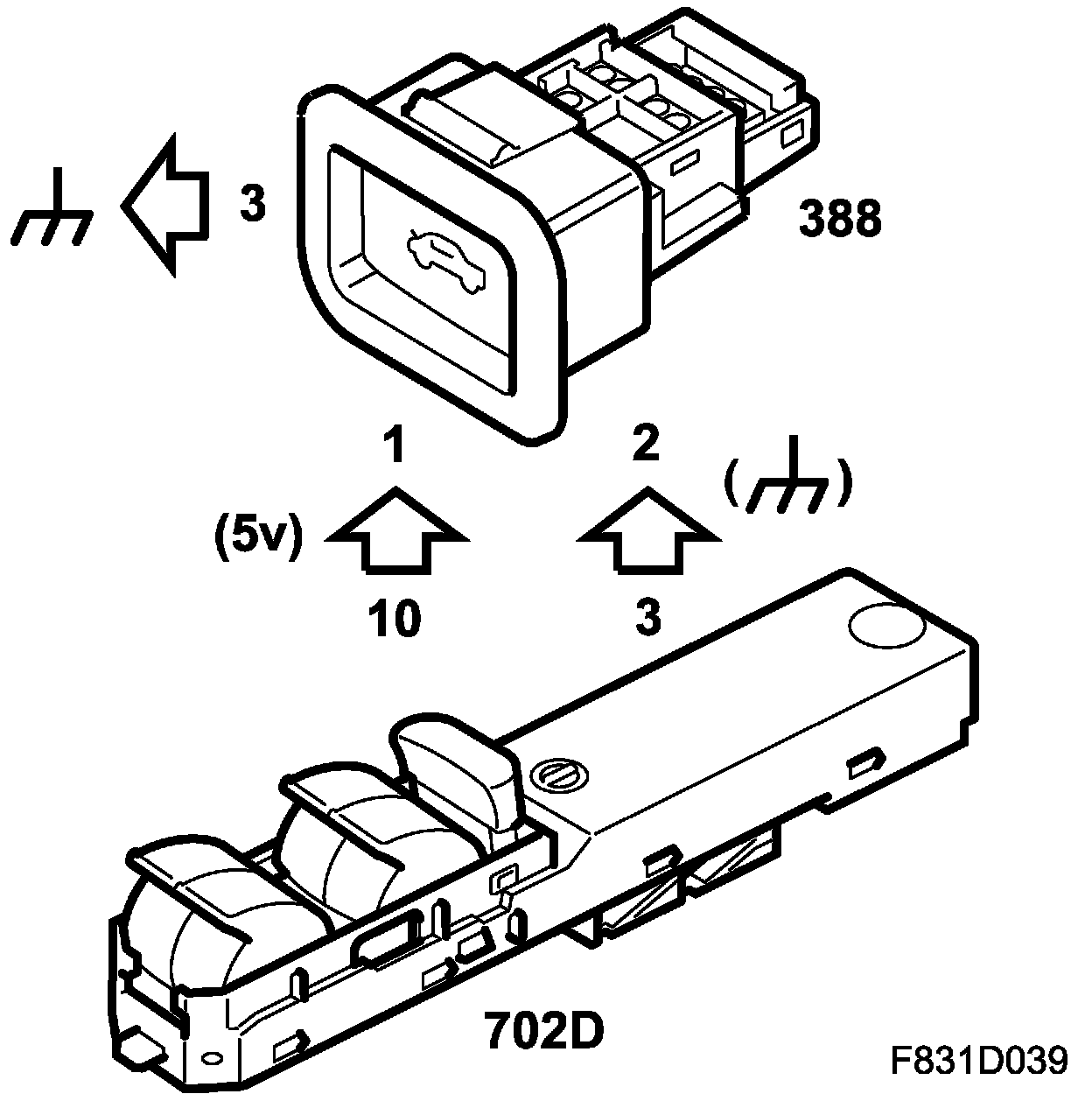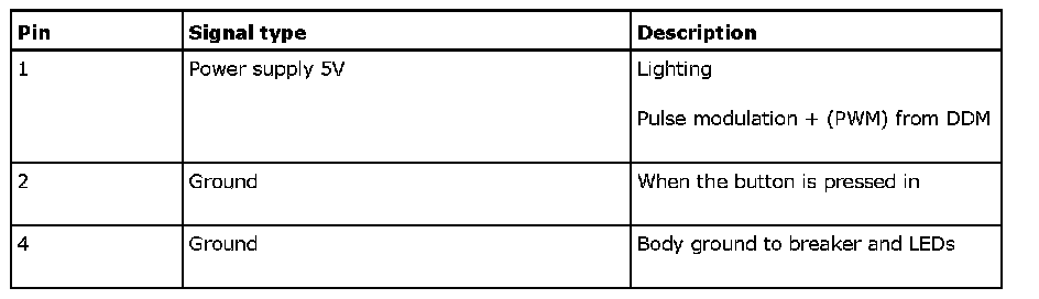 The button has direct chassis grounding and is fed with 5 V via a resistor of 2.7 k Ohms integrated in DDM. The control module input is digital, a voltage above 2 V is interpreted as an open circuit while lower than 2 V is interpreted as closed. The LEDs are fed with PWM+ from DDM and use the same ground as the breaker.