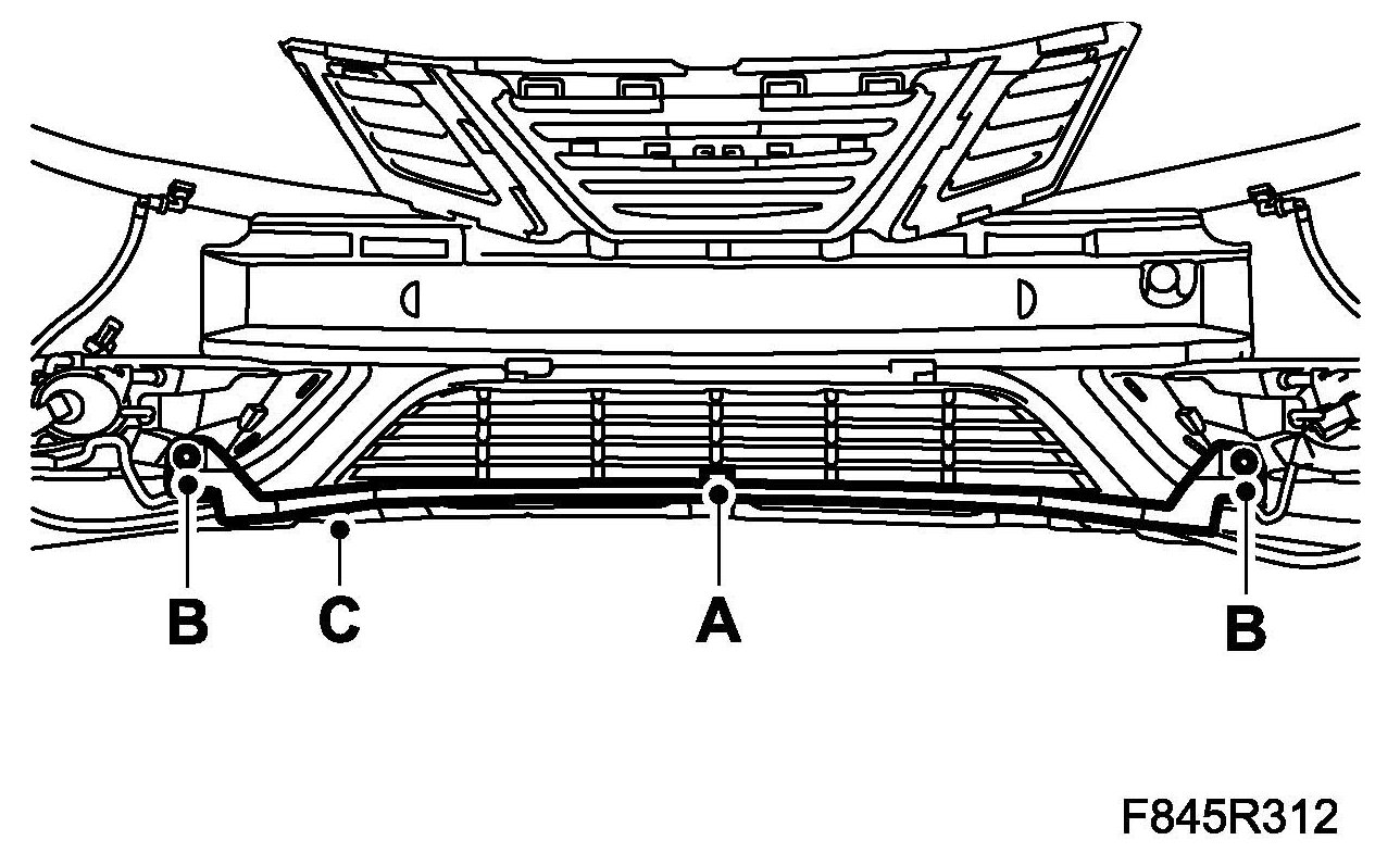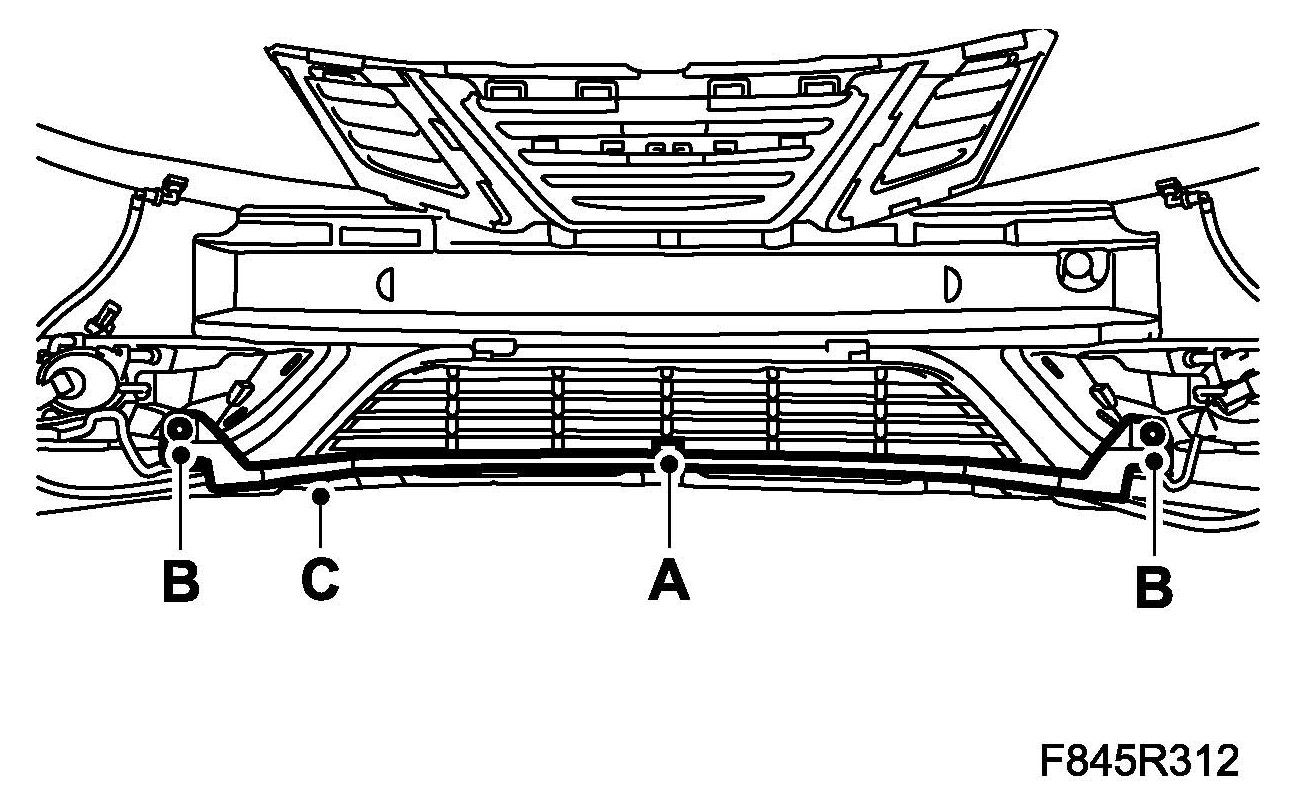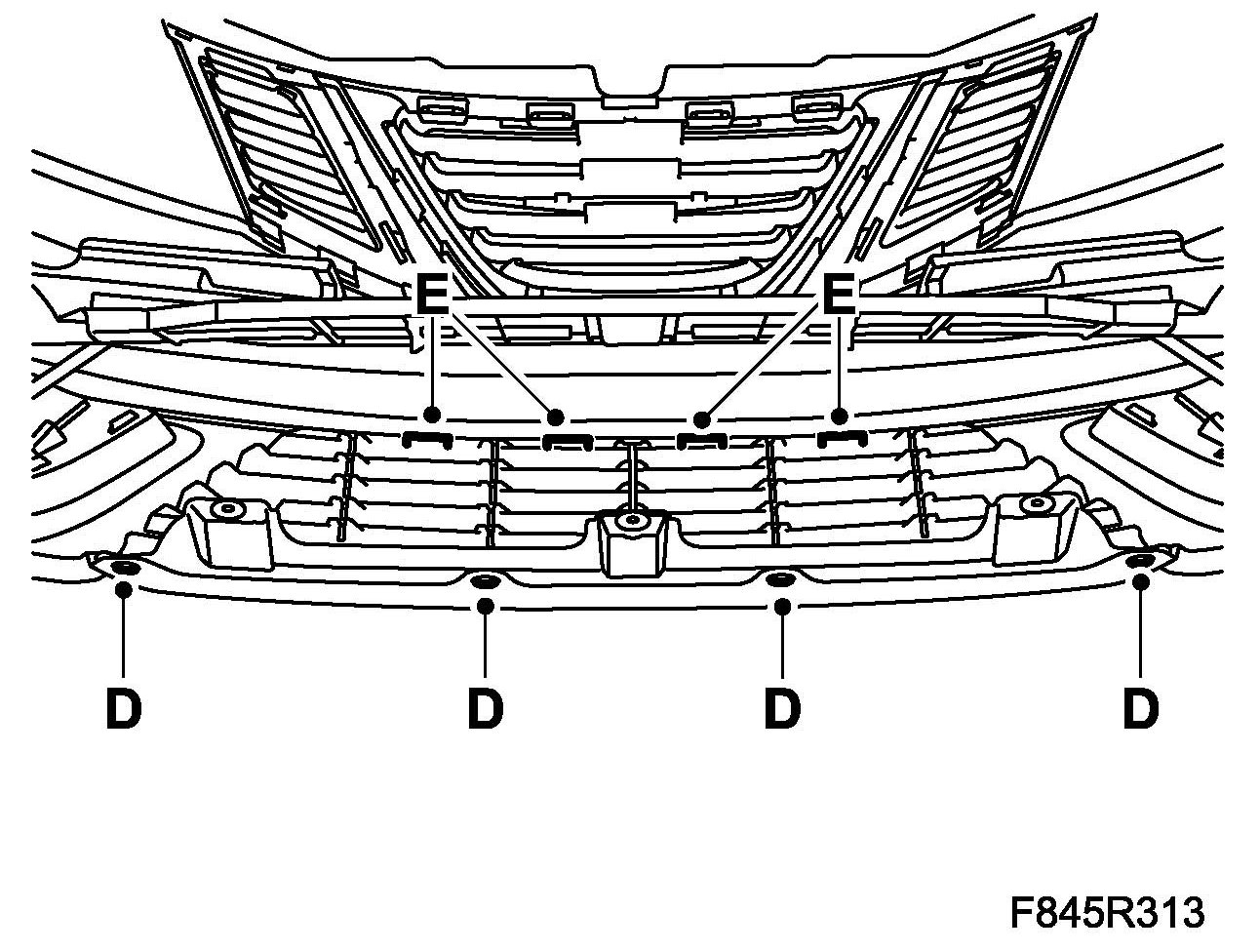 ^ Position the lower grille on the bumper and guide in the lock tabs (E).