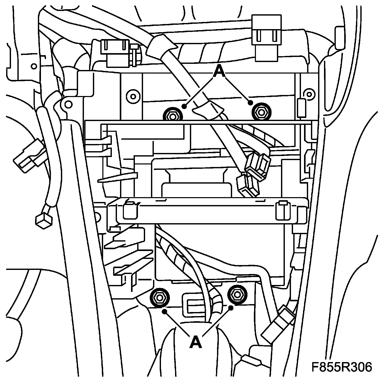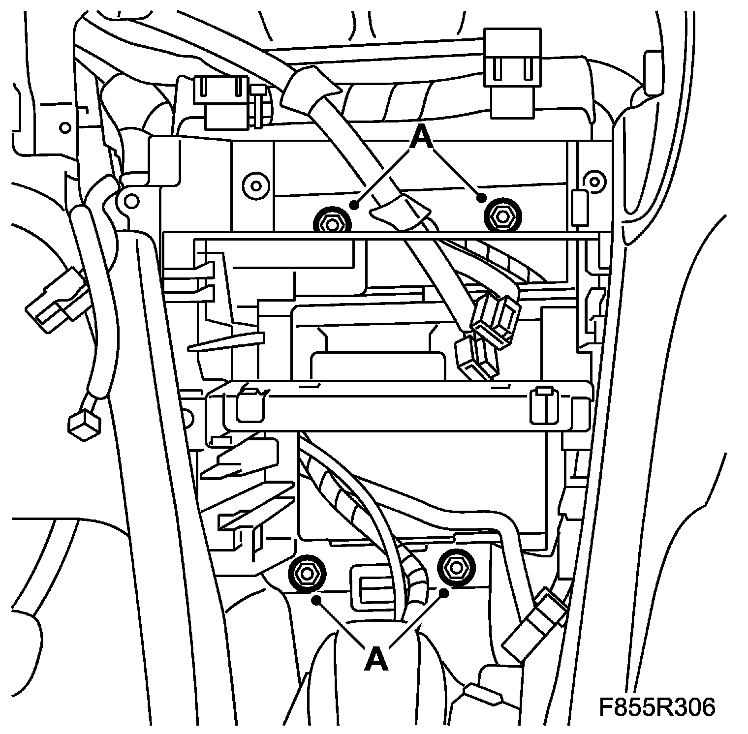 9. Fit the bolts attaching the passenger airbag to the steering column mounting beam (A).