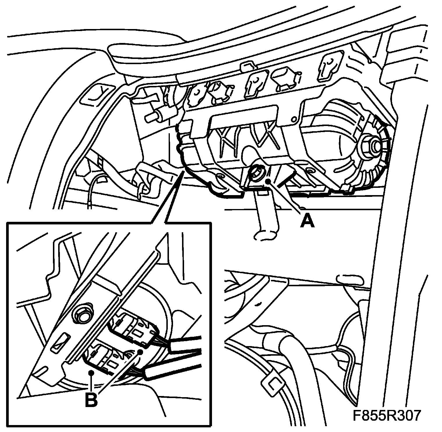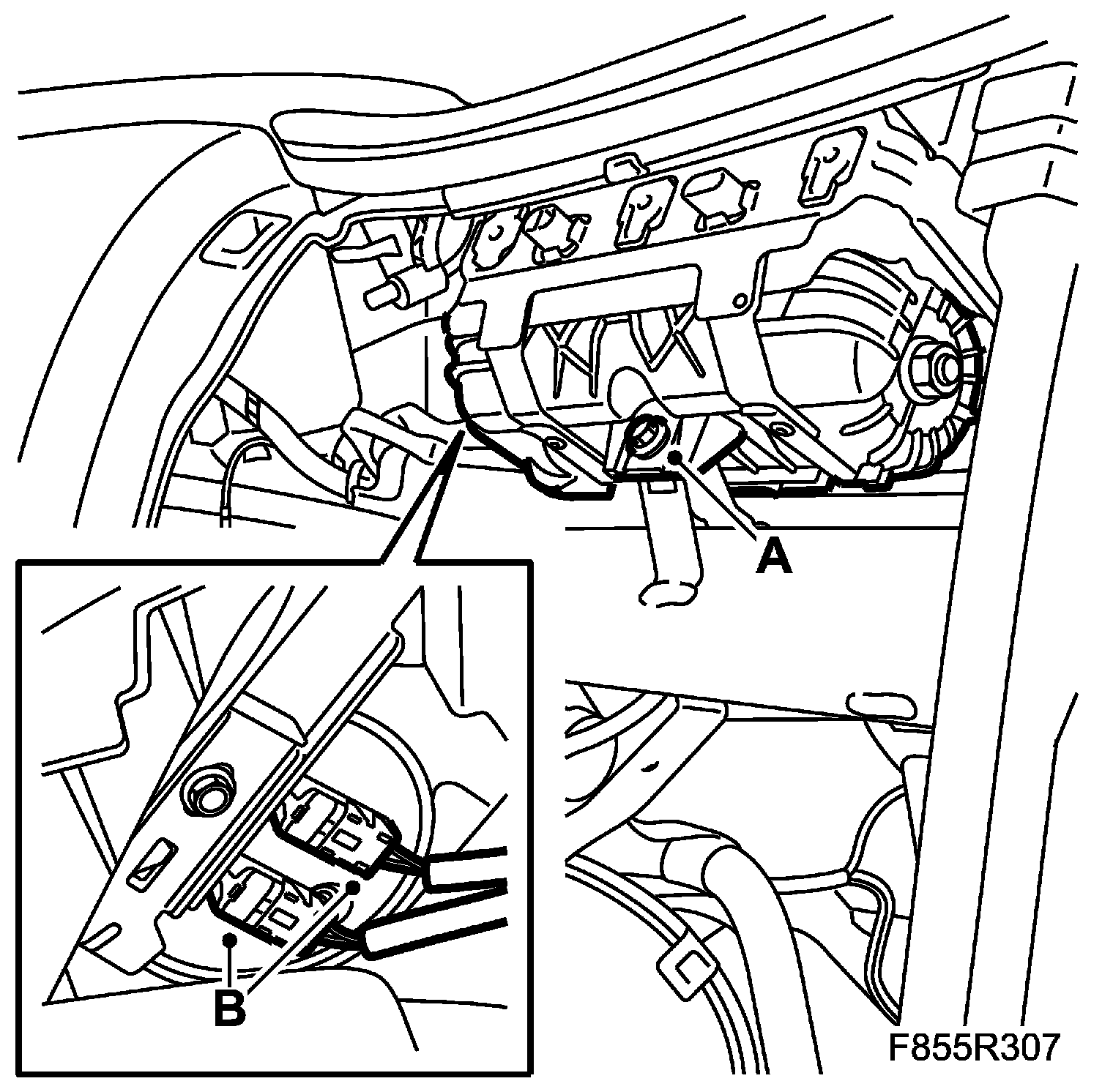 19. Fit the nuts (B) securing the dashboard to the steering column member.