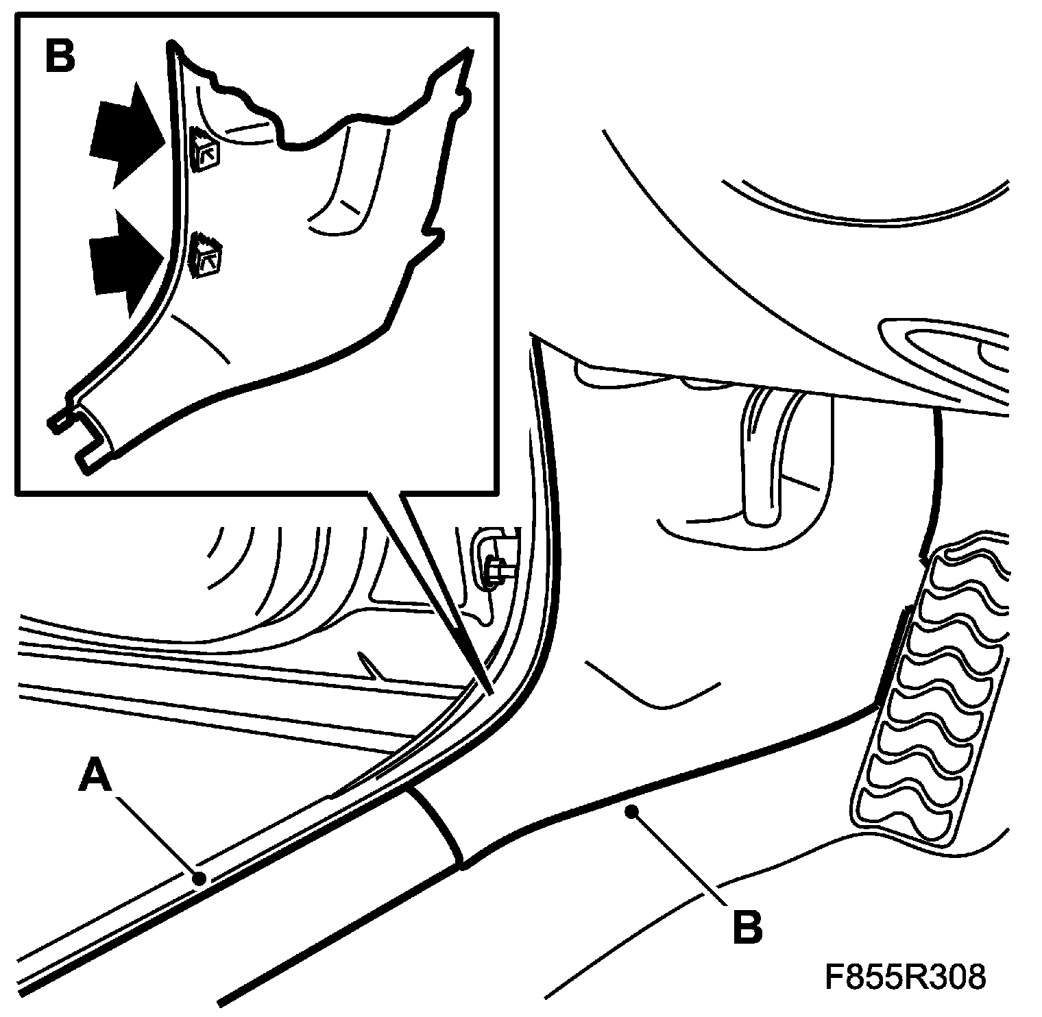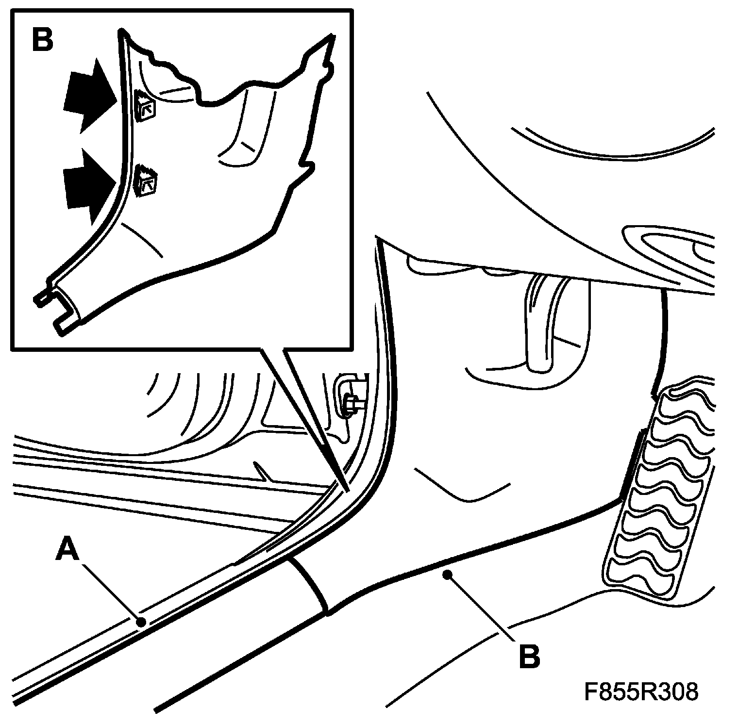 18. Remove the front scuff plates (A) and the lower side panels on the A-pillars (B).