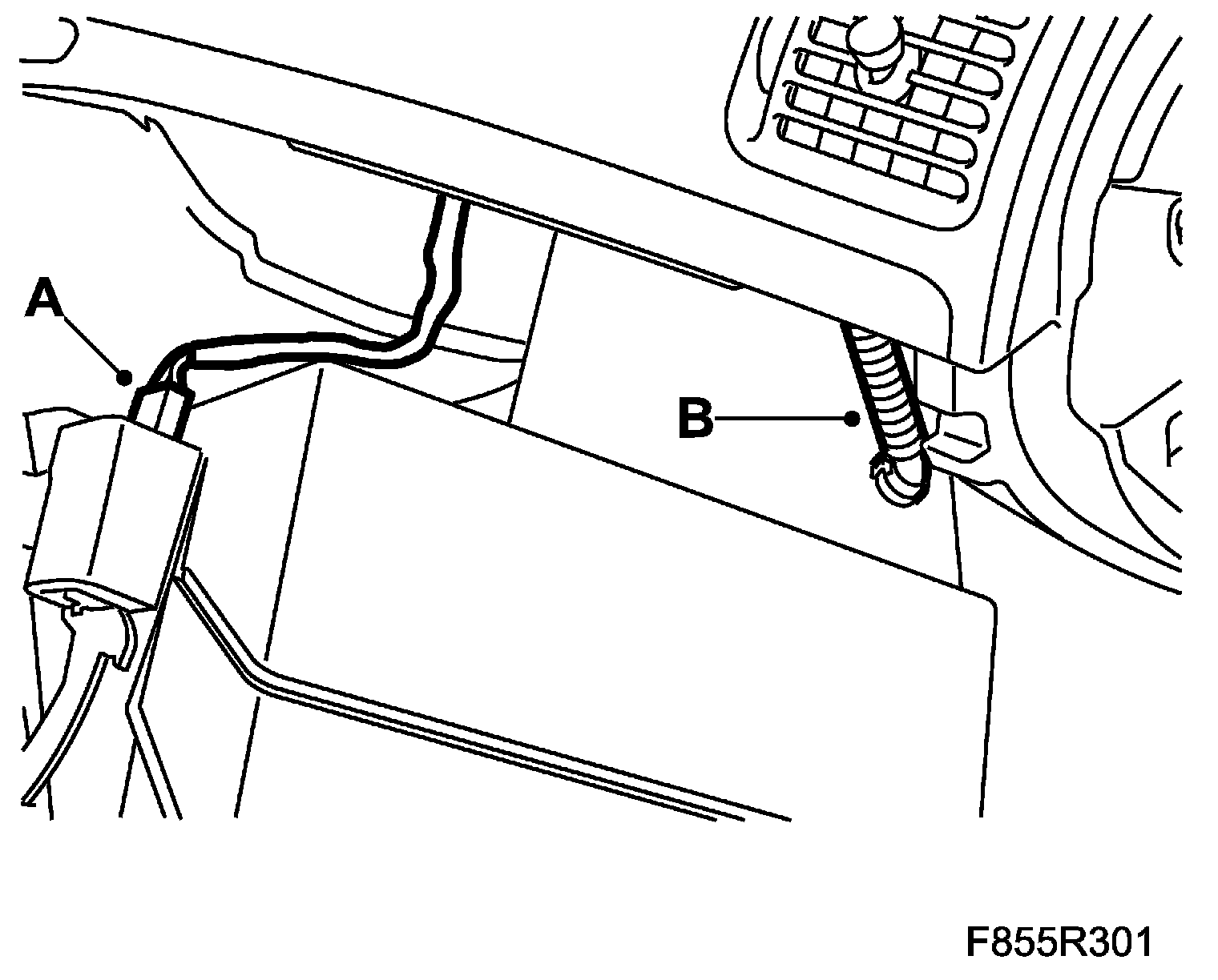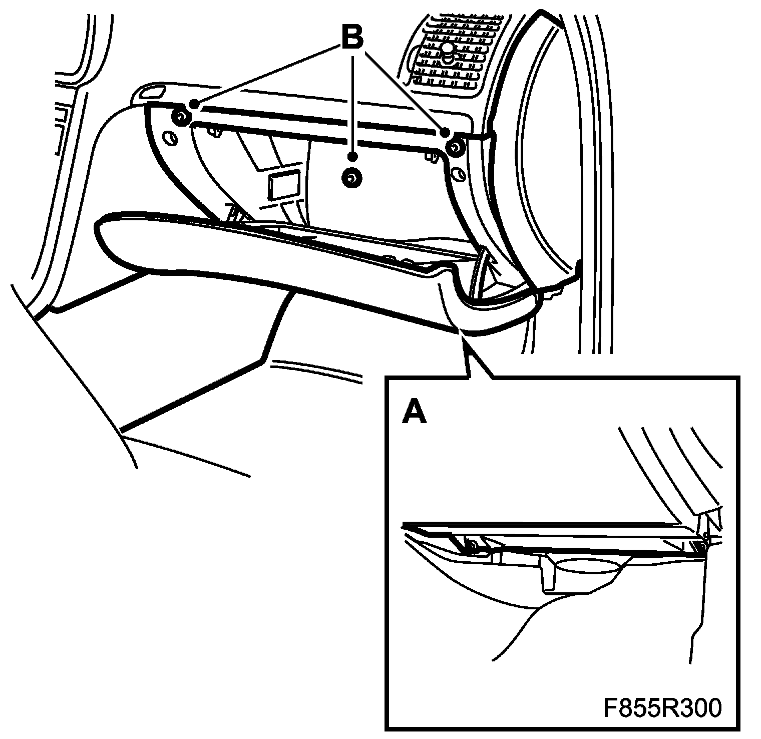 3. Remove the upper bolts (B) and the bolt from the inside of the glove box.