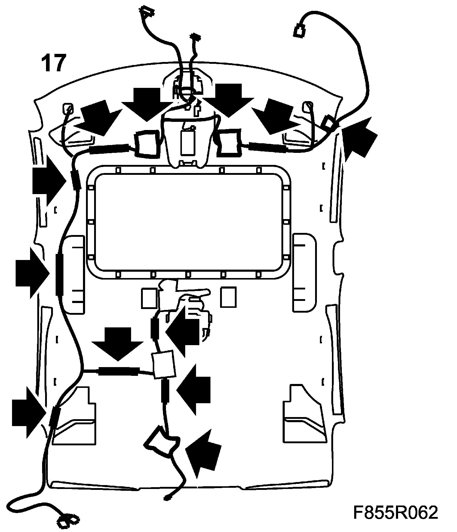 13. Thread the headlining wiring harness through the parcel shelf and connect it to the REC.