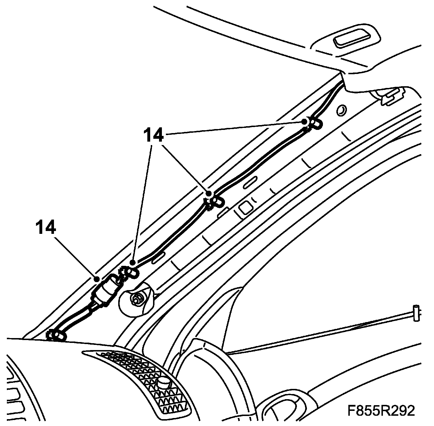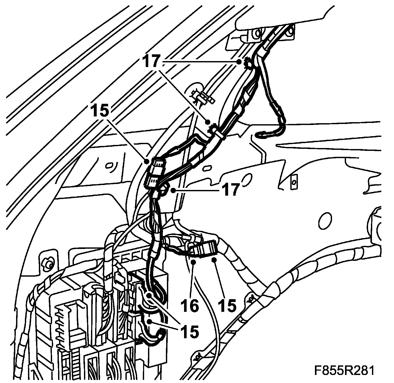 10. Remove the wiring harness clips from the right-hand A-pillar.
