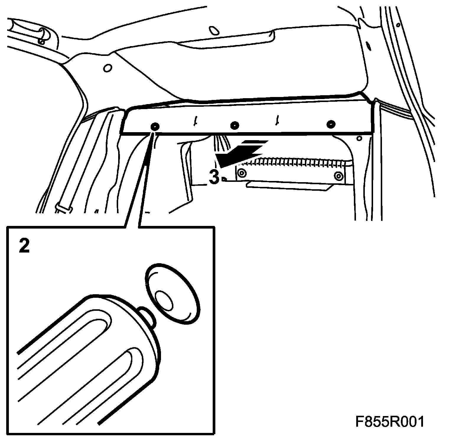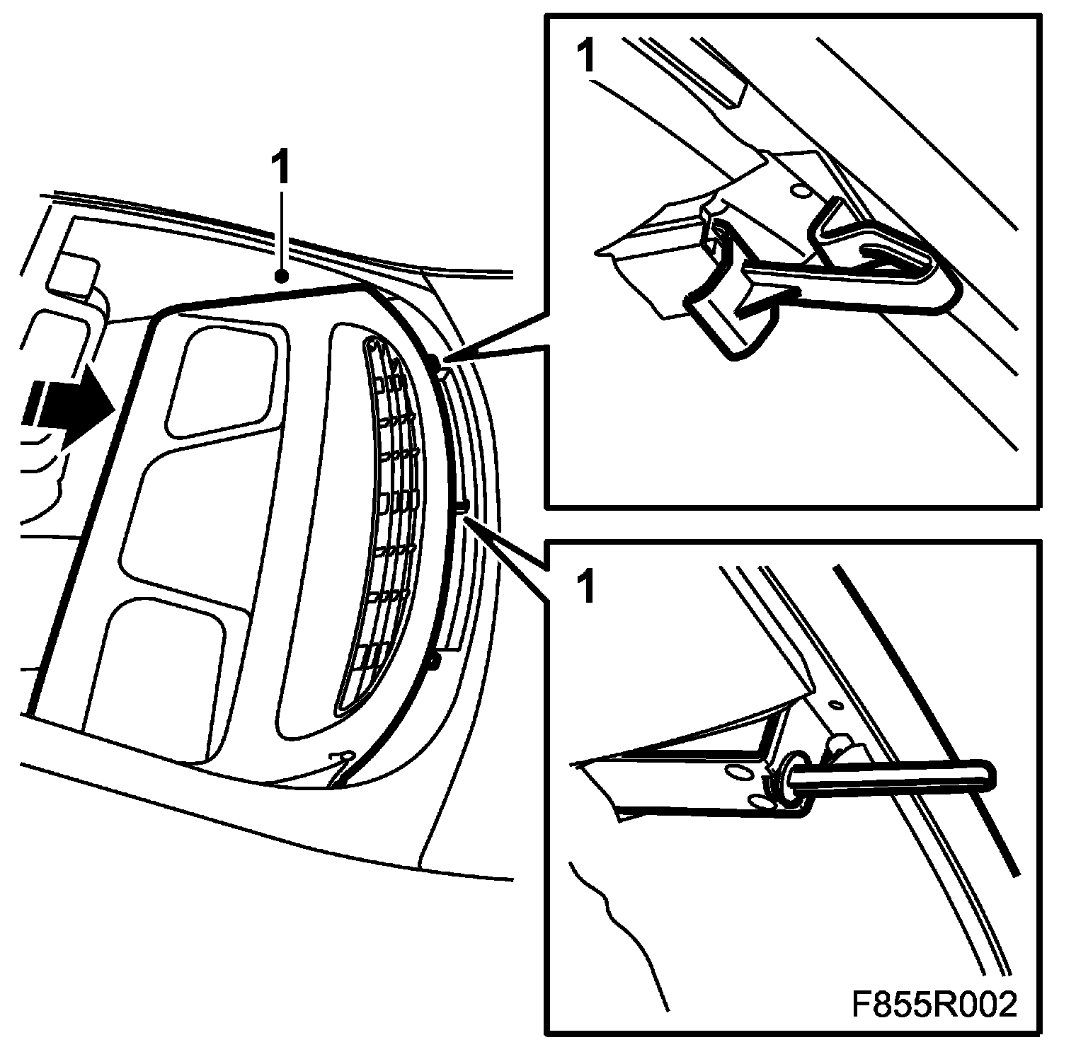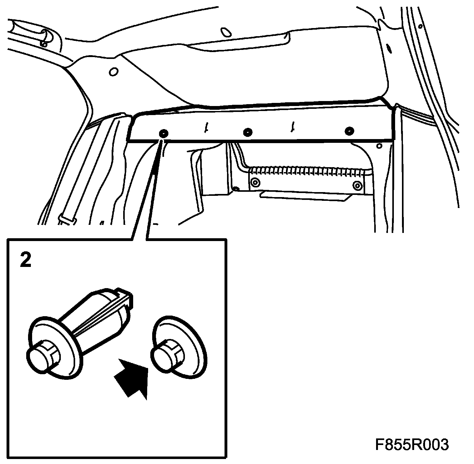 1. Slide in the parcel shelf trim, ensure that the locating lugs fully engage in their mountings on the parcel shelf panel.
