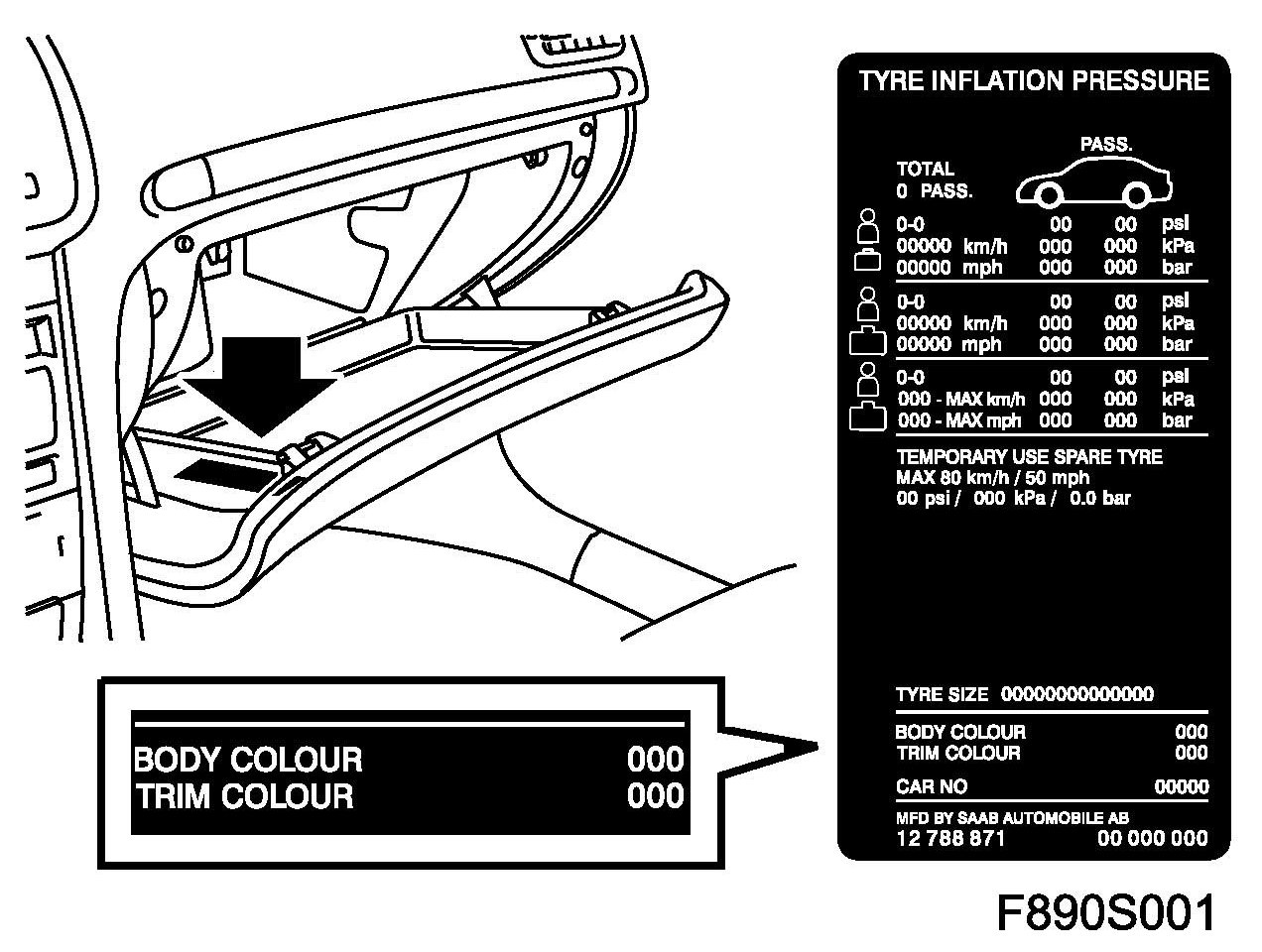 The label for the colour code and tyre pressure on cars with base solid paint is marked with BASE SOLID. The label is situated inside the glove box.