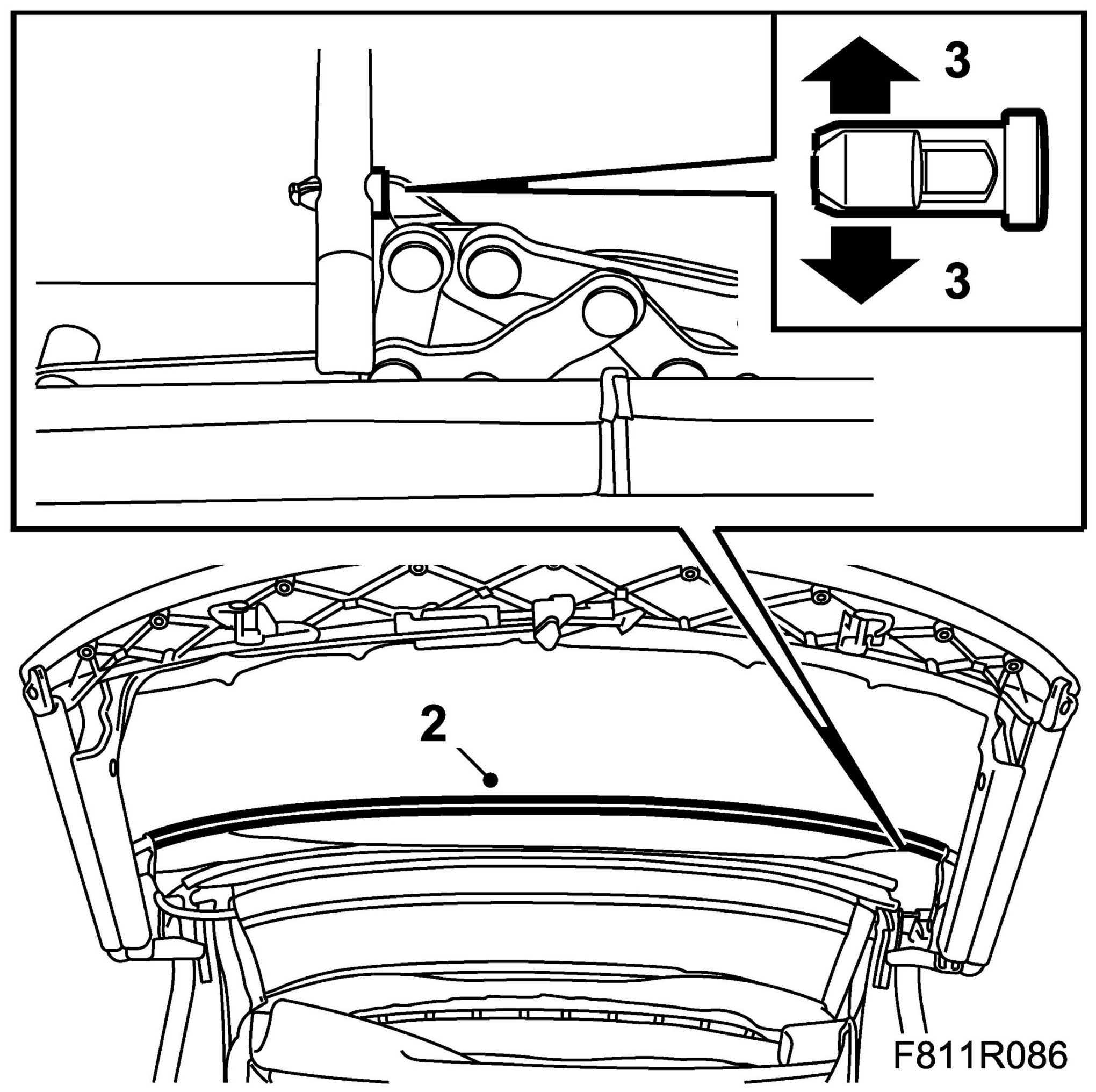 3. Remove the bow mounting locking lug using two screwdrivers. Knock forward the bow together with the bow mounting away from the soft top mechanism.