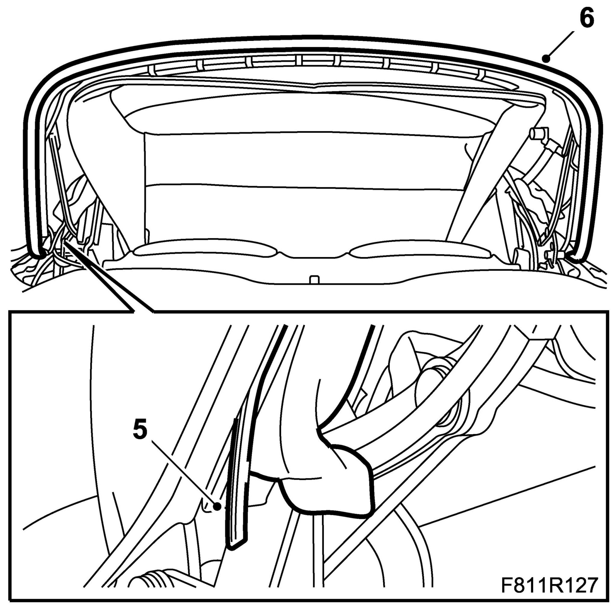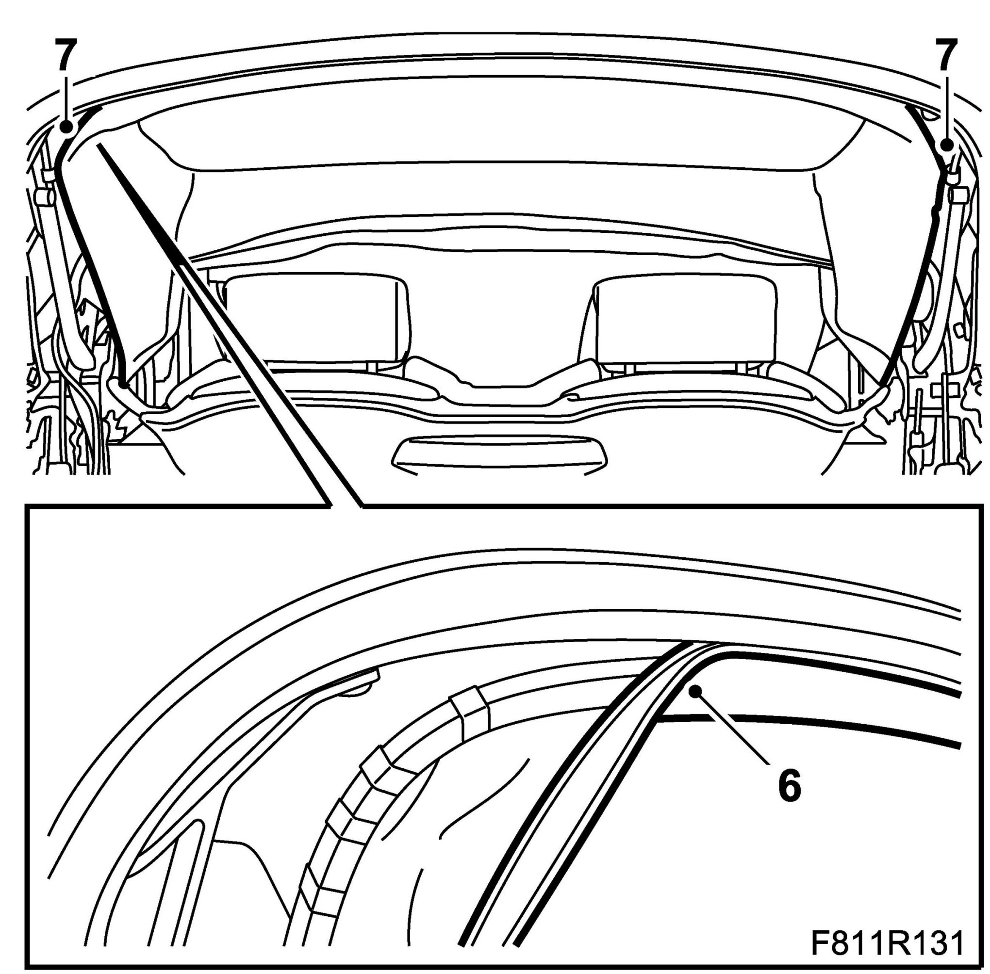 6. Fit the headlining edge reinforcing profile at the rear of the sixth bow groove by pressing it in. Start at the middle and observe the centre markings on the parts.