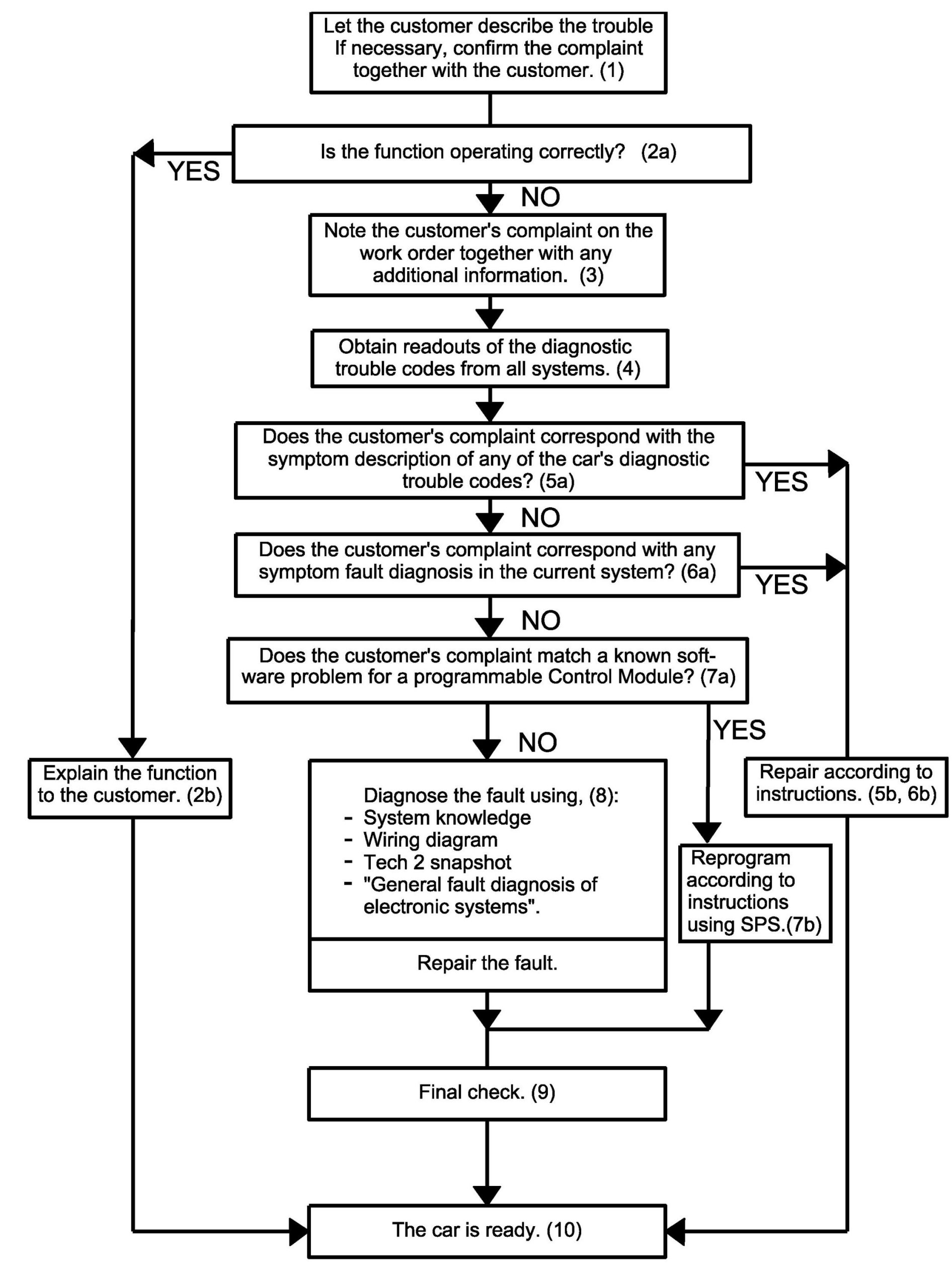 Saab's fault diagnosis strategy assumes that the technician is familiar with the customer's description of the problem. So note the customer's complaint and any other observations on the job sheet.