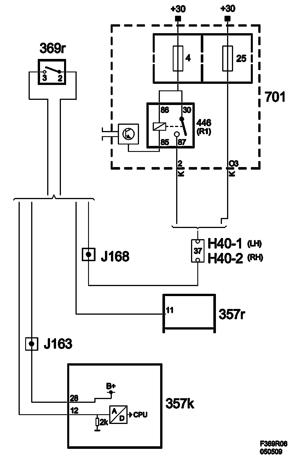 Switch pin 2 is connected to the positive supply via fuse 25 or relay 446. When the switch is made, positive voltage is supplied to the relay unit (357r) pin 11 from switch pin 3.