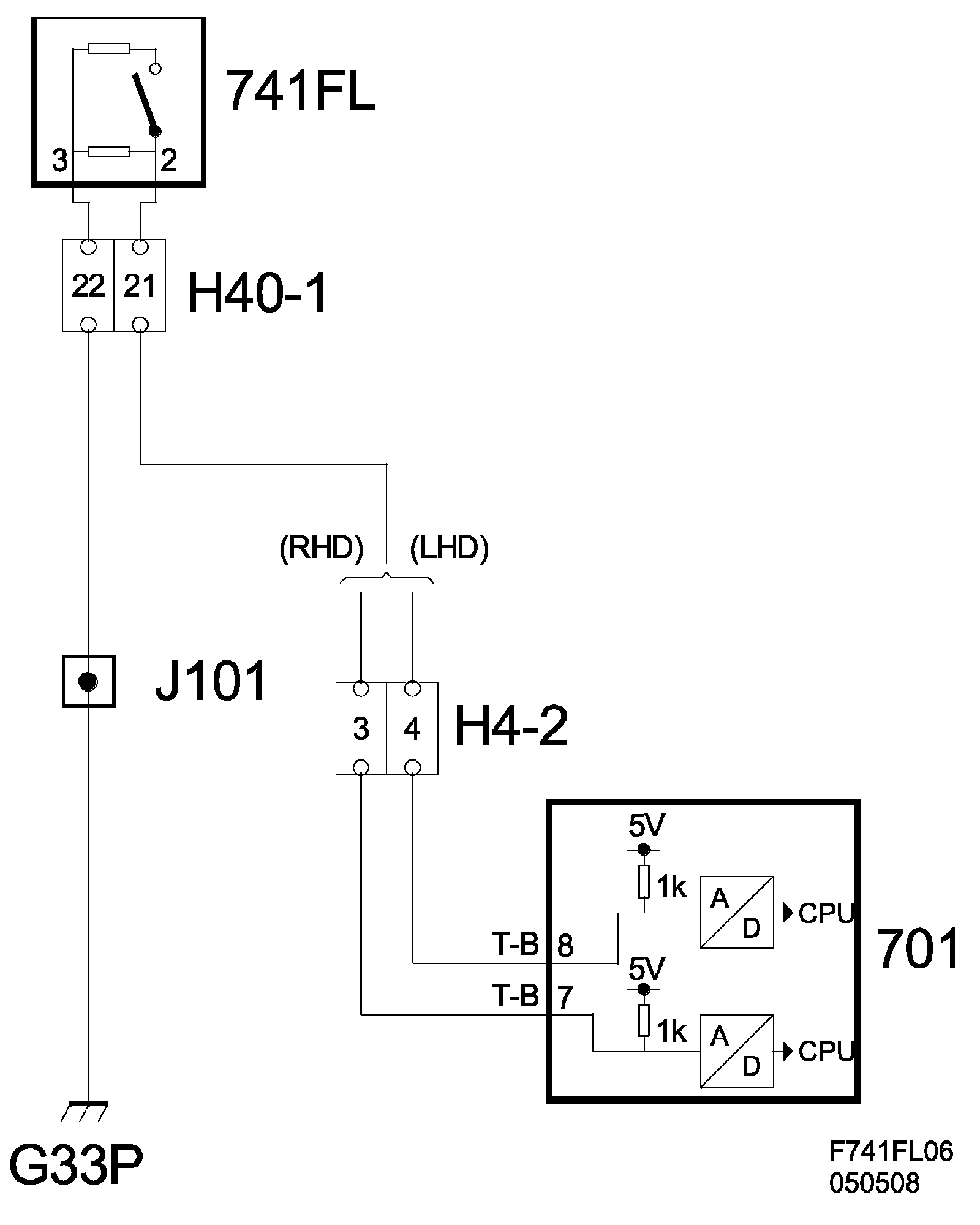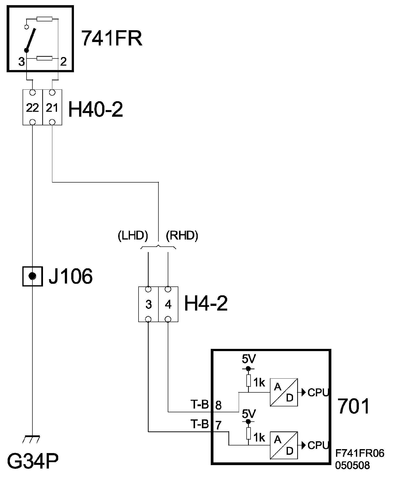 Switch pin 3 is grounded to grounding point G33P for 741FL and G34P for 741FR. Switch pin 2 is connected to REC (701) pin 8 for 741FL and pin 7 for 741FR. When the switch is open, the voltage is about 5 V on pins 7 and 8. When the switch is closed, the voltage is about 3.5 V.