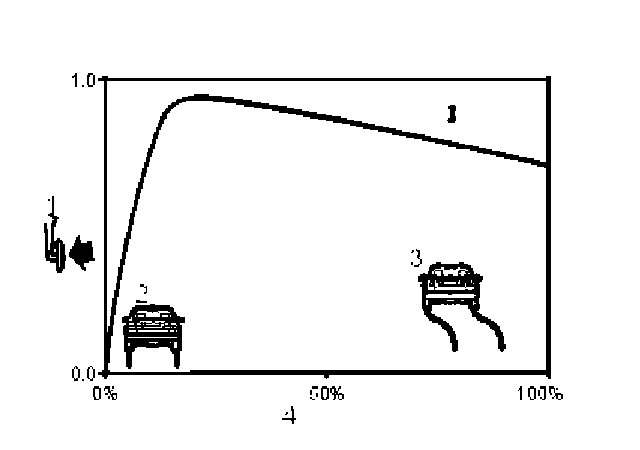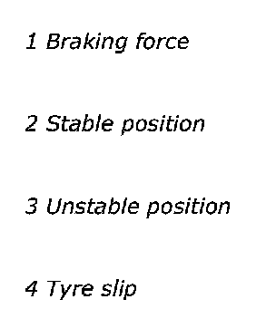 When the brake is first applied at 0% slip, braking force increases sharply but the degree of slip increases only gradually up to a certain limit. Beyond that point, braking force decreases with increasing slip.