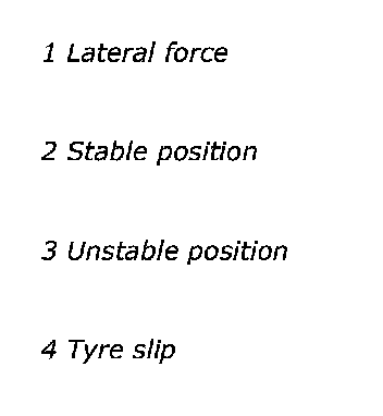 Slip also occurs when the tire is called upon to transmit a lateral force, e.g. during cornering. Diagram 2 shows how the lateral force falls away sharply with increasing slip. At 100% slip, i.e. when the wheels have locked up, no lateral force remains for steering and the driver will no longer be able to control the vehicle.