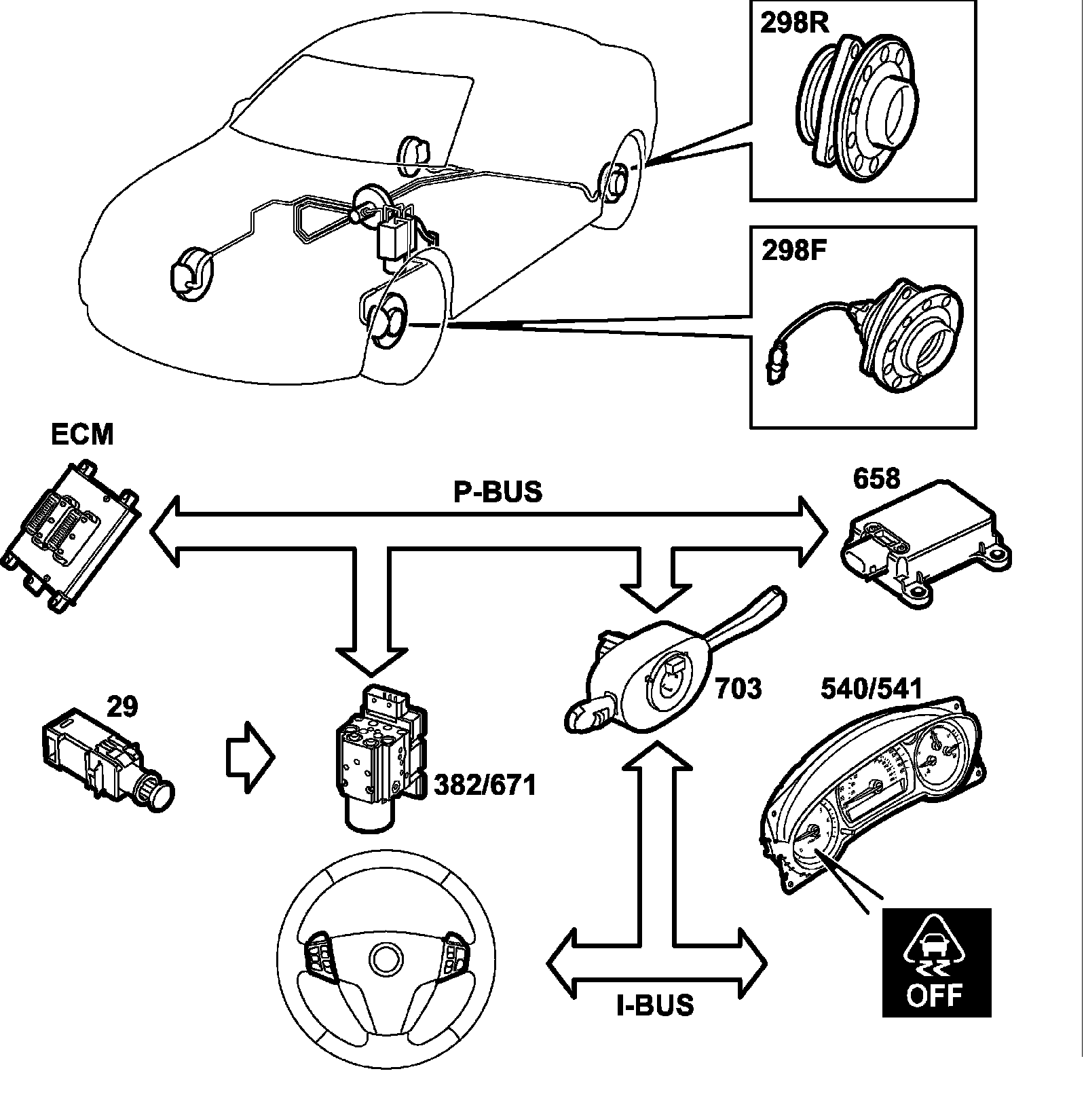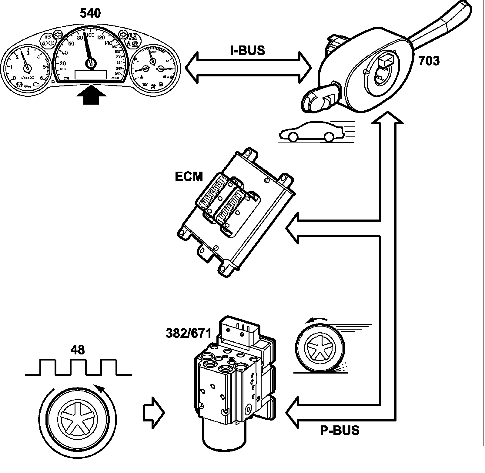 Several other car systems require information regarding vehicle speed. The control module, which is connected to the P-Bus, provides information regarding the speed of all wheels.