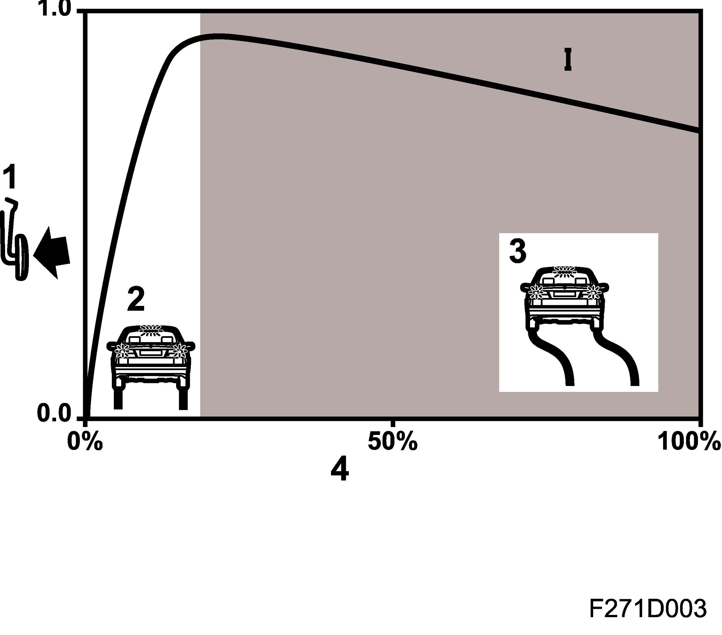 When the brake is first applied at 0% slip, braking force increases sharply but the degree of slip increases only gradually up to a certain limit. Beyond that point, braking force decreases with increasing slip.