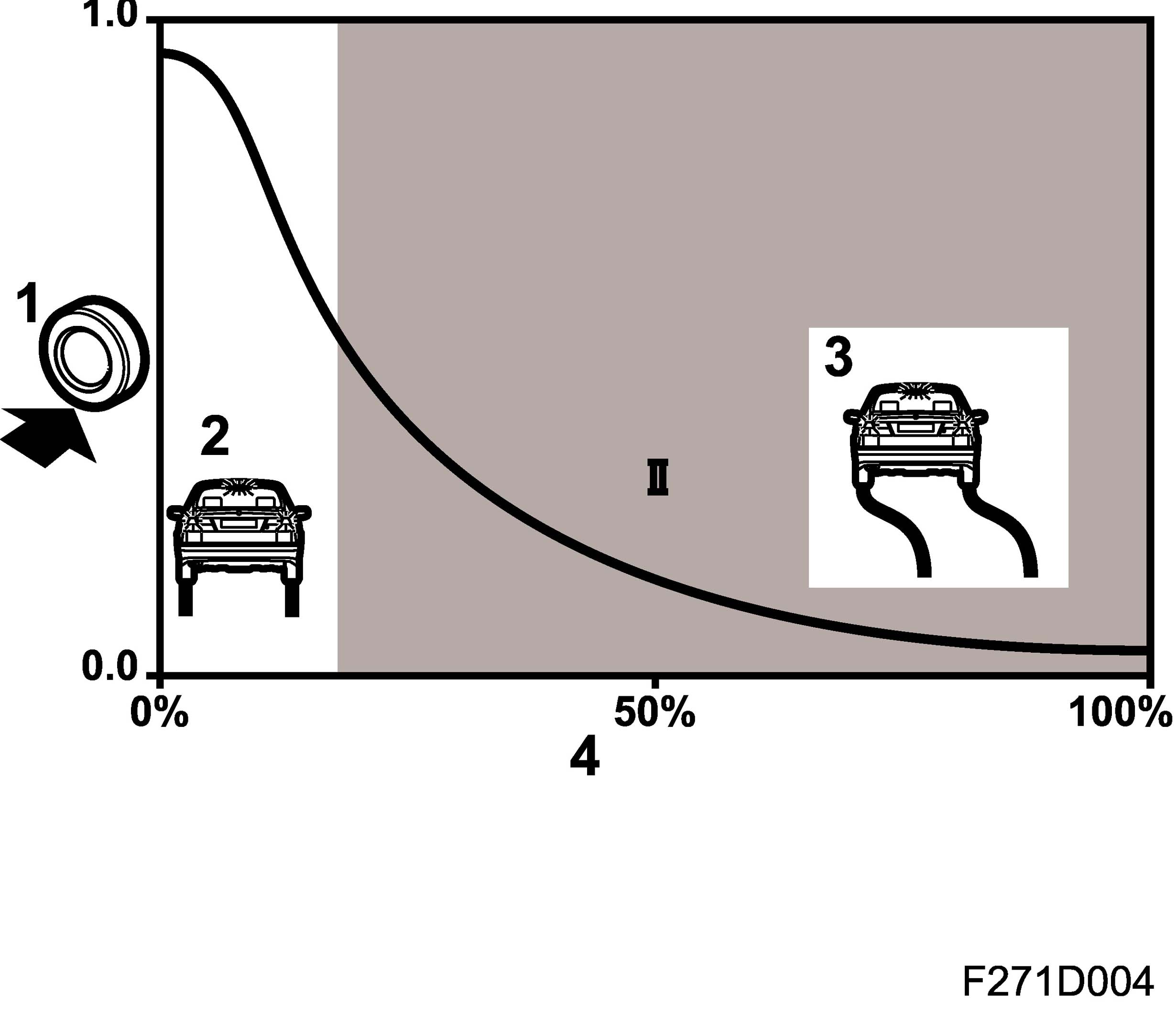 Slip also occurs when the tire is called upon to transmit a lateral force, e.g. during cornering. Diagram 2 shows how the lateral force falls away sharply with increasing slip. At 100% slip, i.e. when the wheels have locked up, no lateral force remains for steering and the driver will no longer be able to control the vehicle.