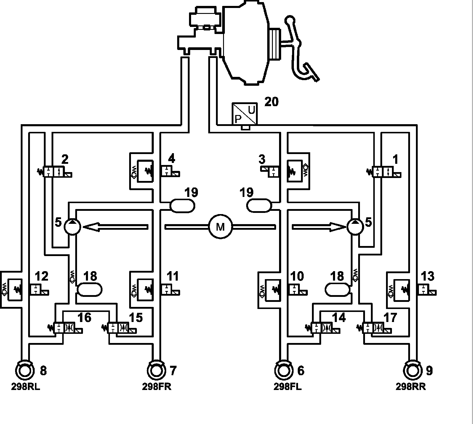 The inlet and outlet valves in the valve block are in their rest positions, i.e. the inlet valves are open and the outlet valves are closed.