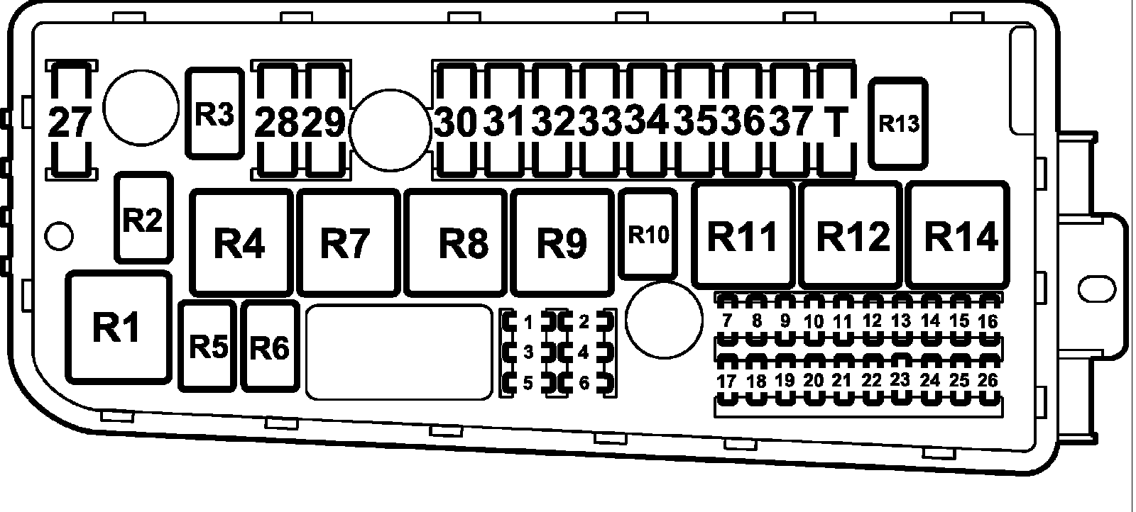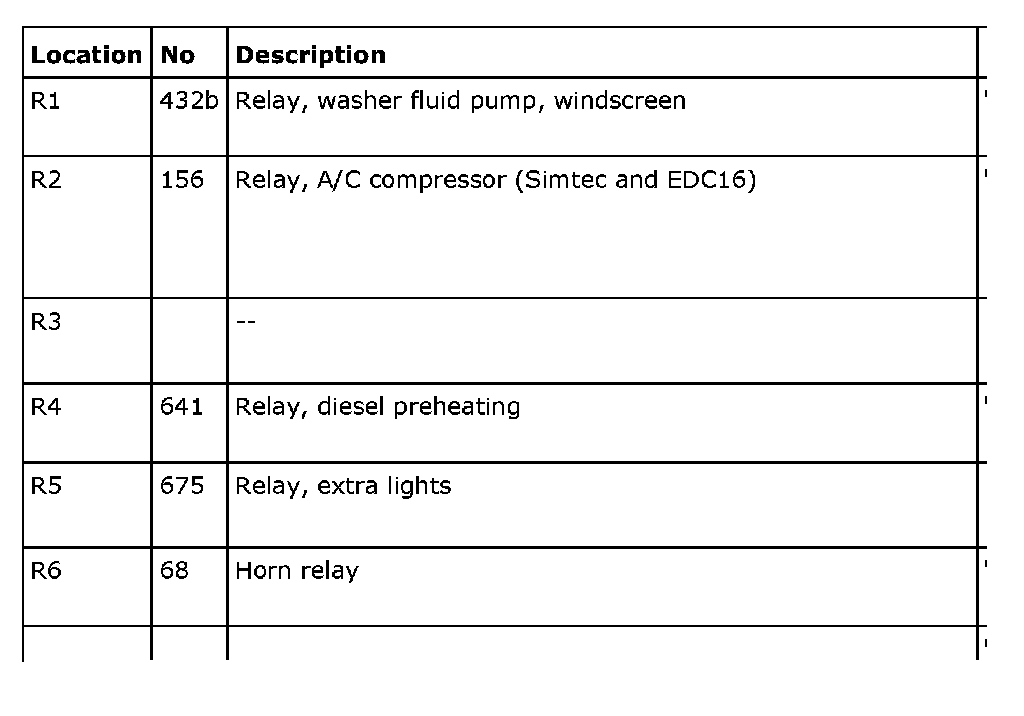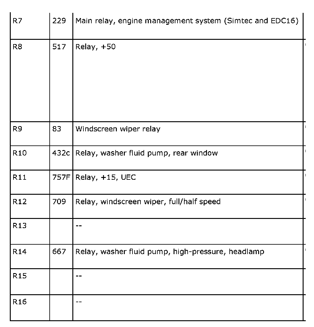 The electrical center can contain a greater number of relays than those listed below. In such cases, these are not connected to a wiring harness.