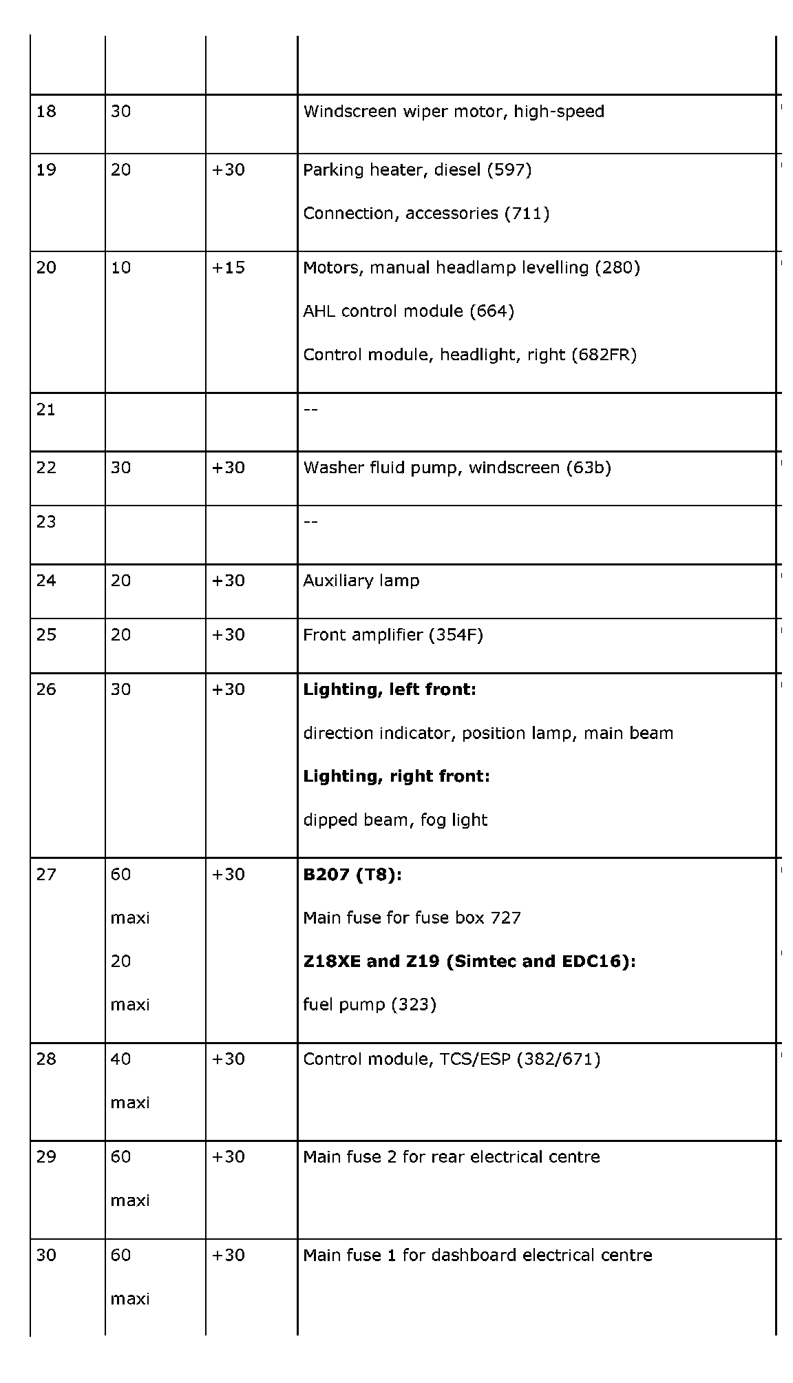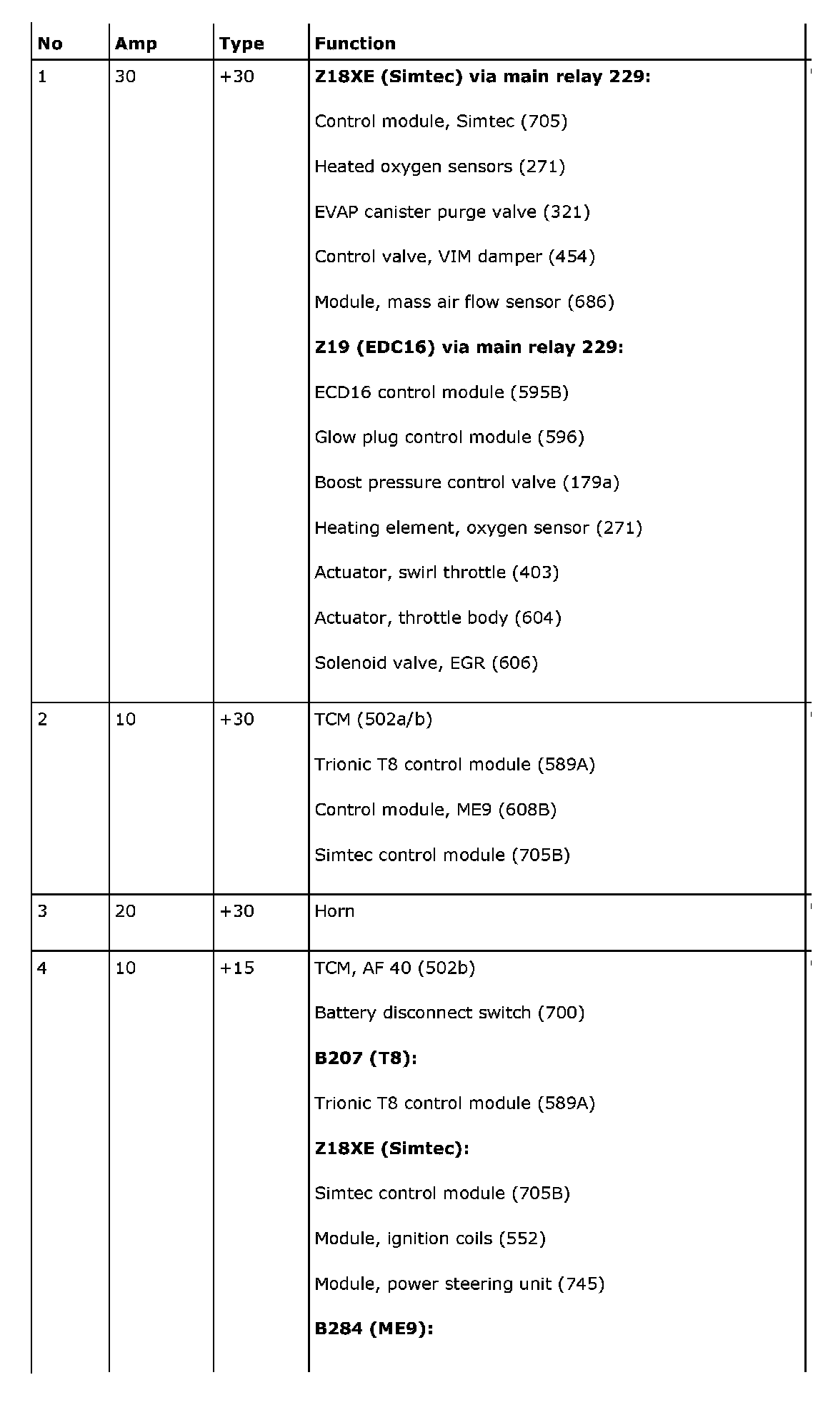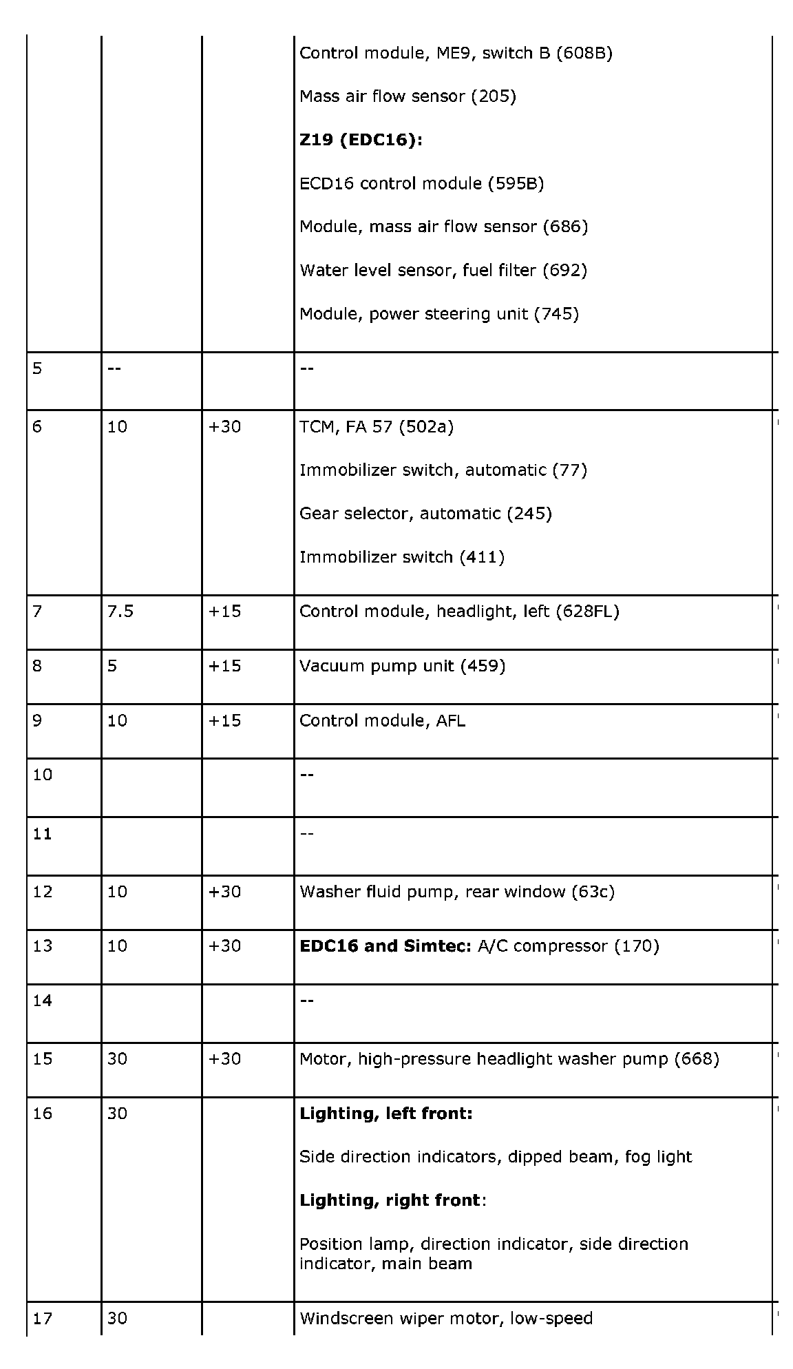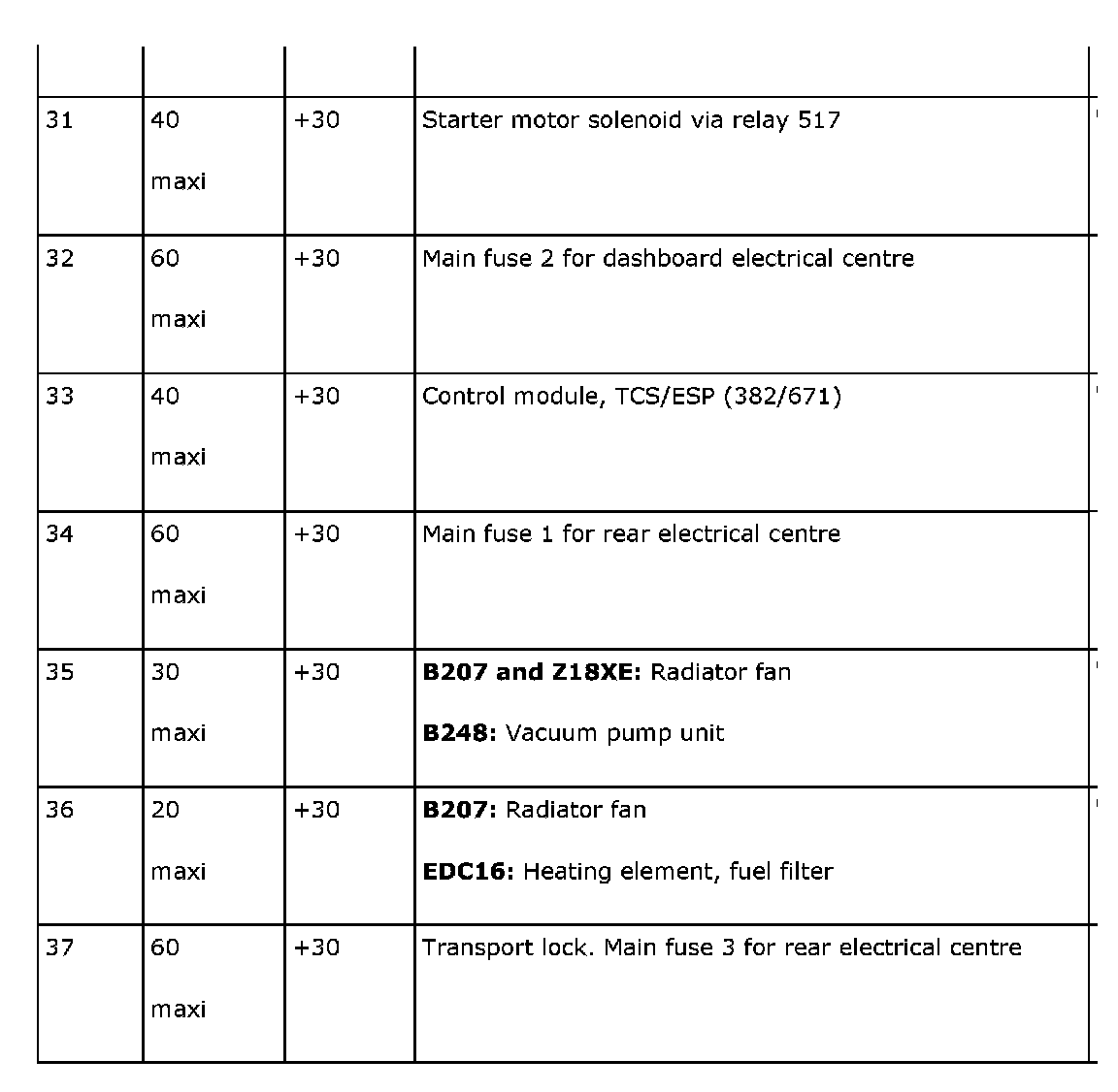 The electrical center can contain a greater number of fuses than those listed below. In such cases, these are not connected to a wiring harness.