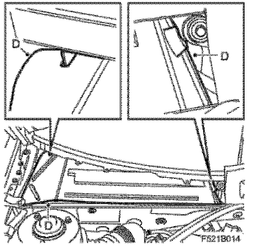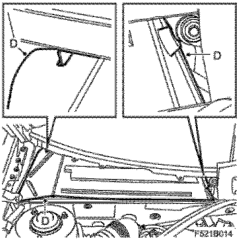 ^ Align the cover (C) and start to fit it from the left-hand side. Guide in the corner against the windscreen trim and the left-hand wiper spindle. Lift the foam block away and insert the hook under the windscreen. Align the cover against the right-hand wiper spindle. Fold down the corner tab so that it passes the hinge and bonnet. Align the corner tab under the windscreen trim. Insert the hook under the windscreen and press the cover down so that the clips engage.