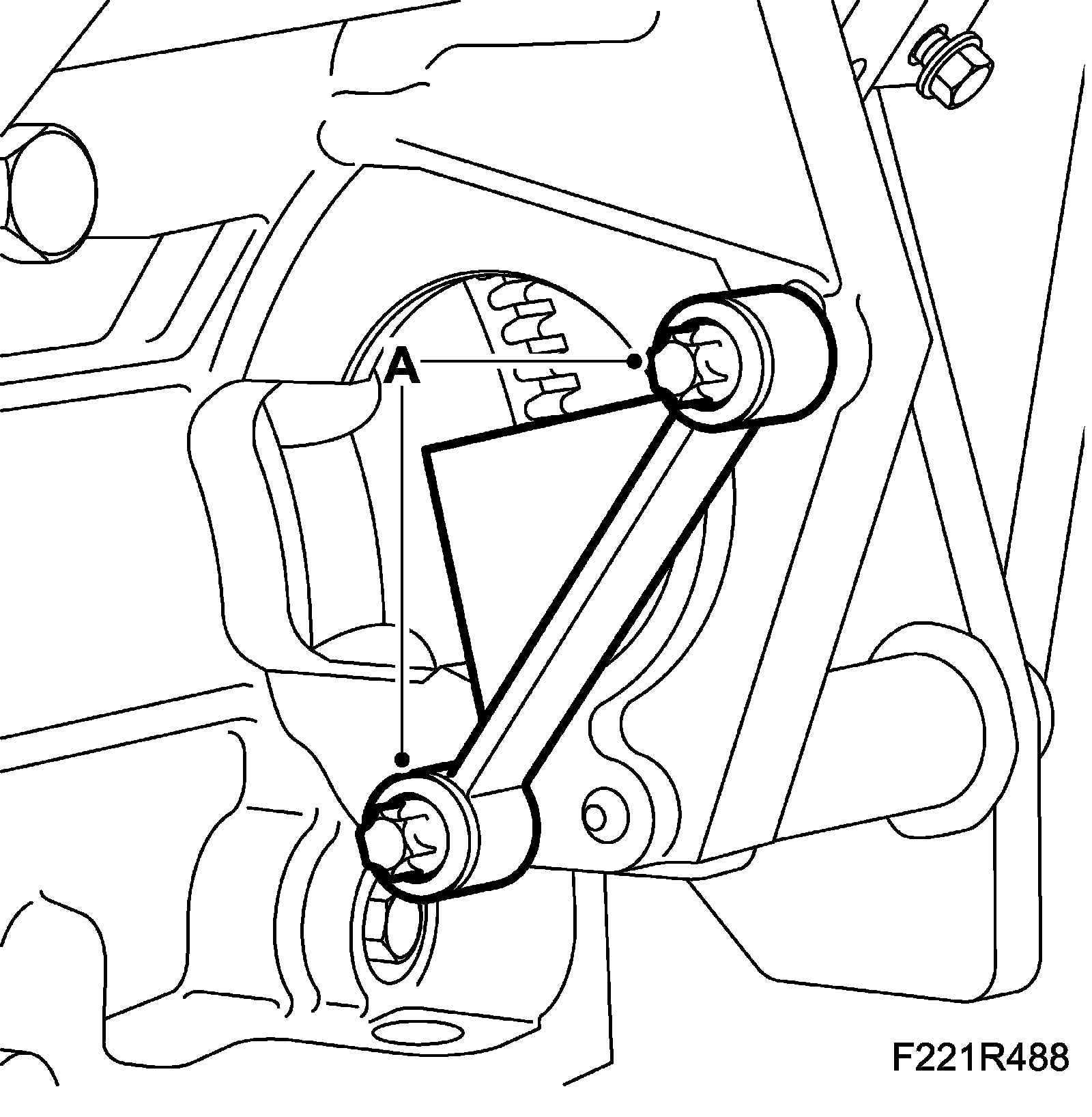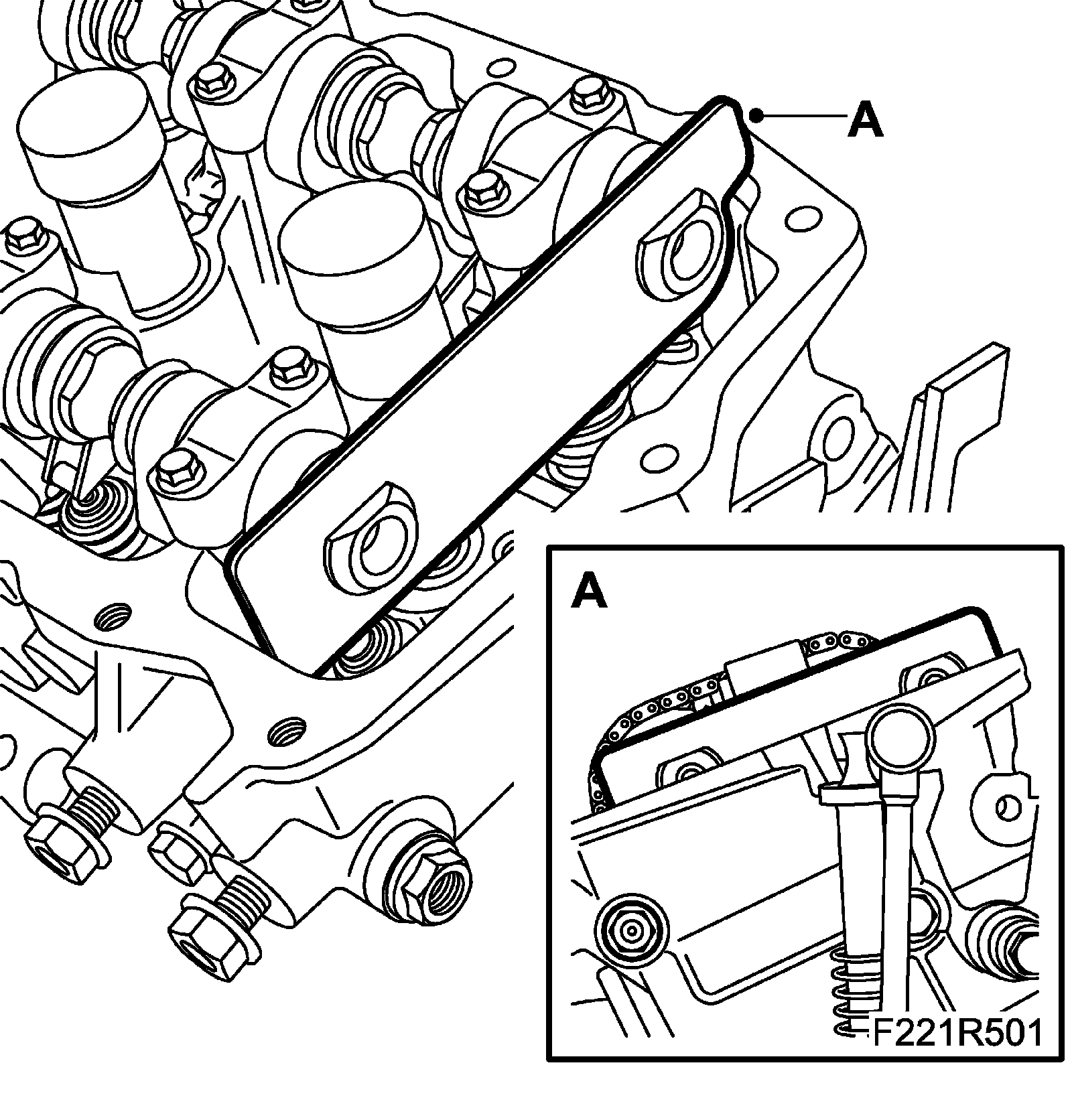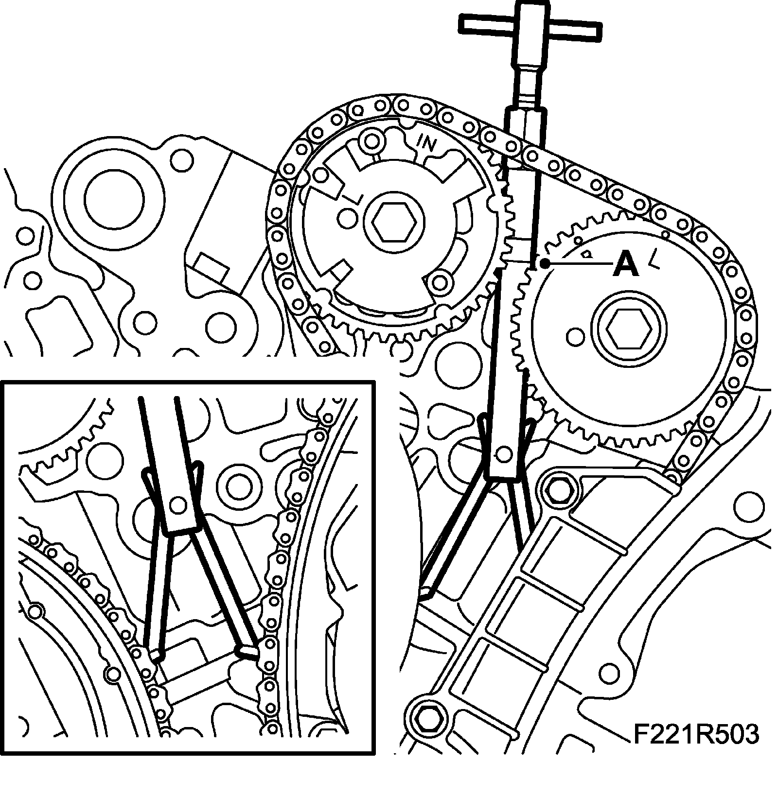 19. Fit EN-48313 Fixing tool to the camshaft chain. Check that the tool grips the chain firmly, and that the lower groove of the tool (A) is level with the upper section of the cylinder head. (The timing cover is removed in the illustration for an improved view of how the tool should be fitted.)