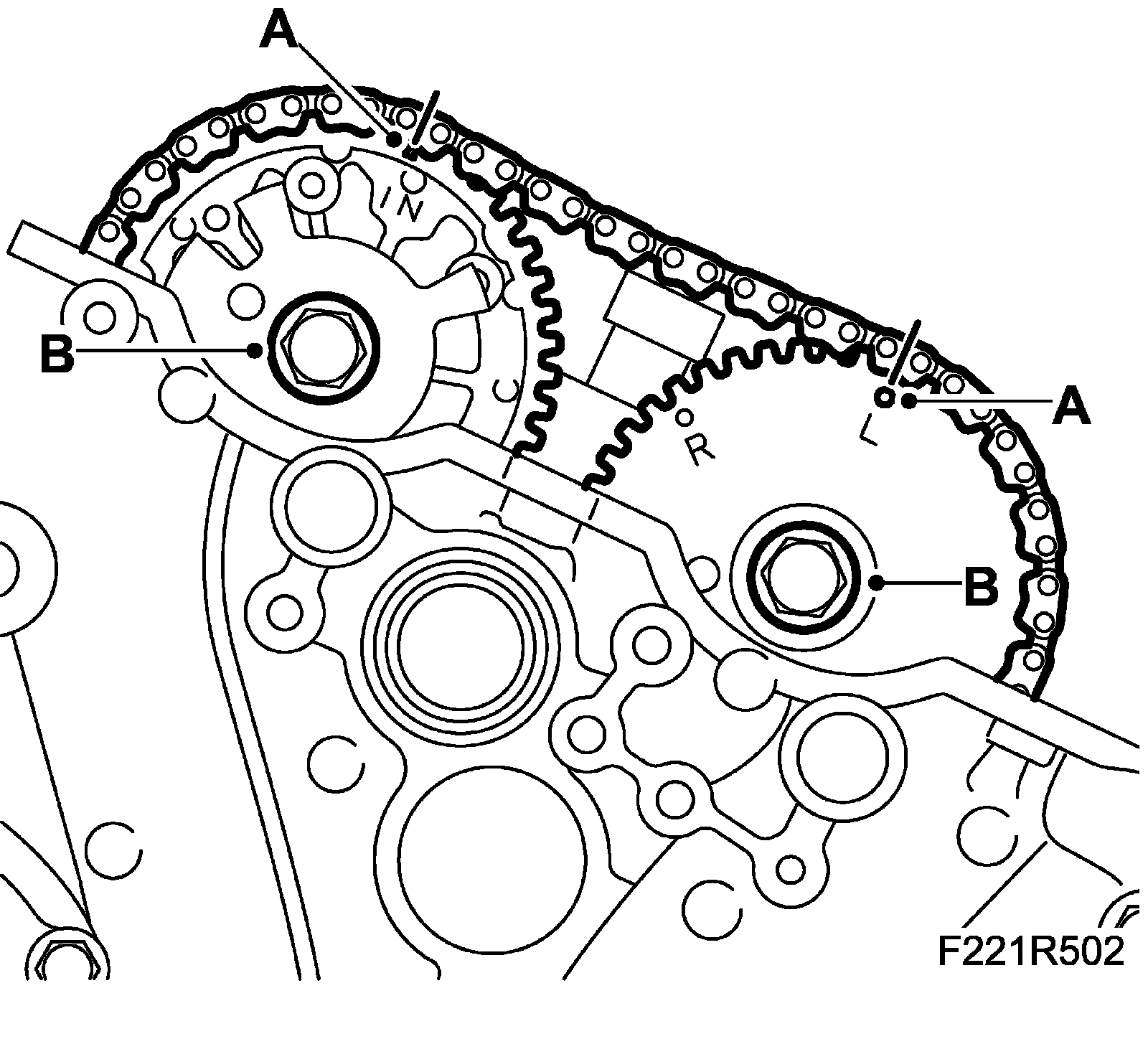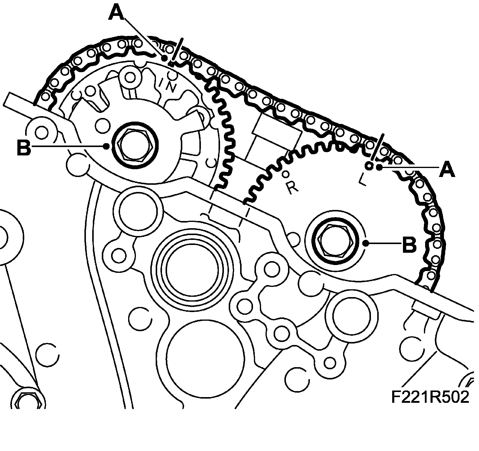18. Loosen the torque on the bolts (B) holding the camshaft sprockets. Counterhold using an open spanner on the camshaft flats (do not remove the bolts).