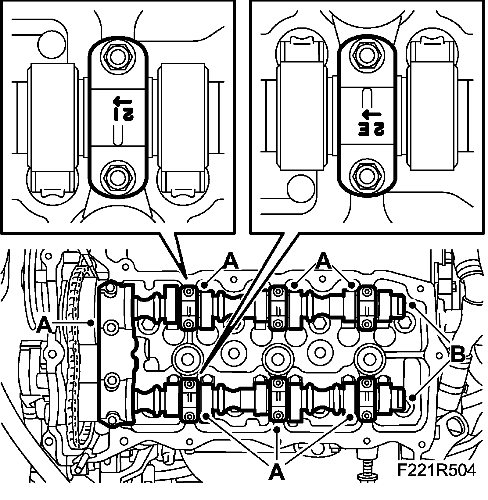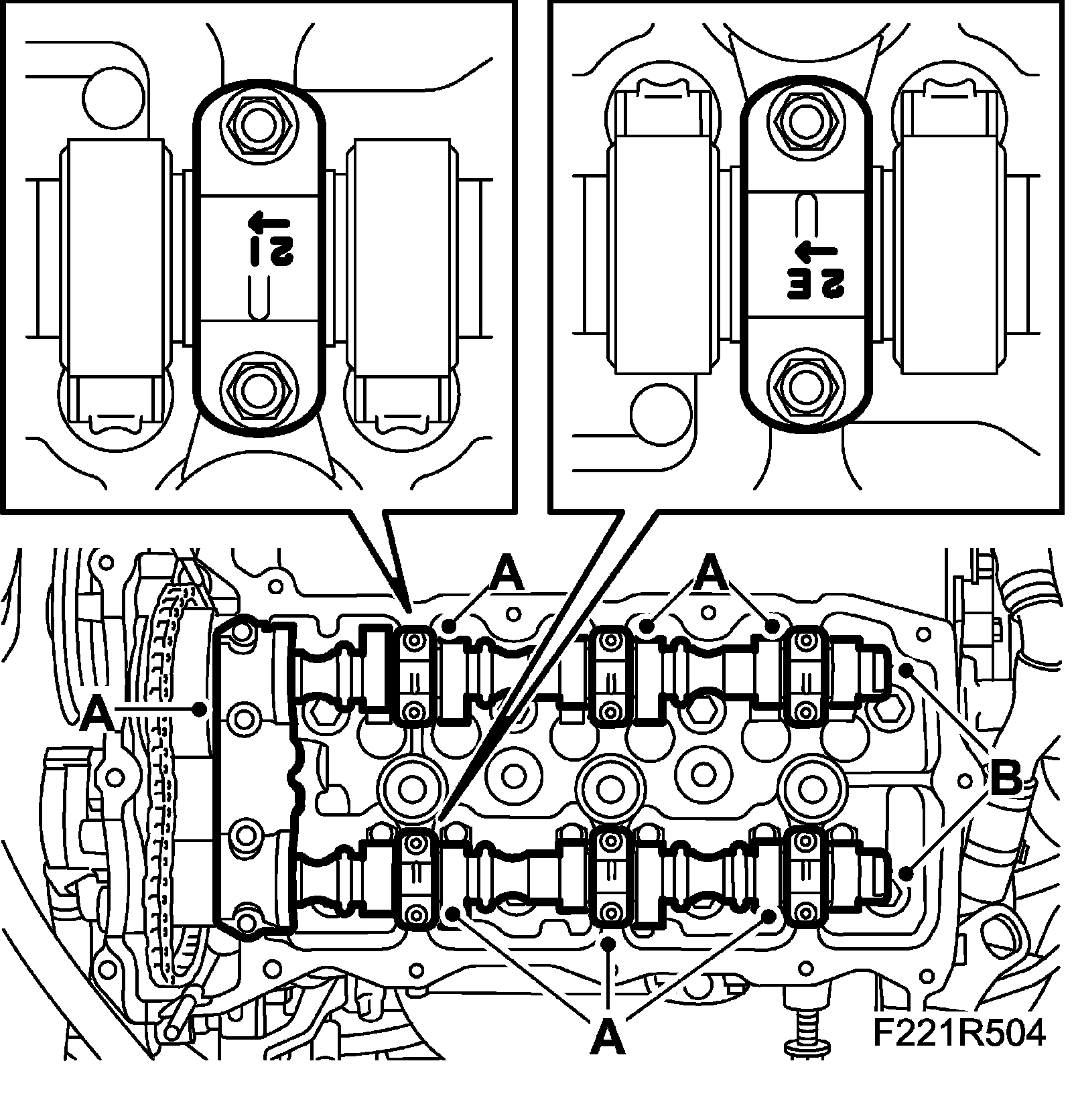 23. Remove the camshaft bearing caps by loosening the bolts in stages - 1/2 to 1 turn. It is important that the removal ends at the bearing cap where the tappets are loaded. Note the markings on the bearing caps when refitting to ensure that they are in the correct locations (A).