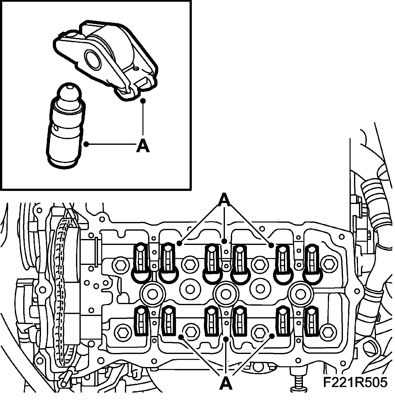 25. Remove the roller rockers and the hydraulic adjuster elements (A). Store them in 83 93 787 Valve stand so they do not get mixed up.