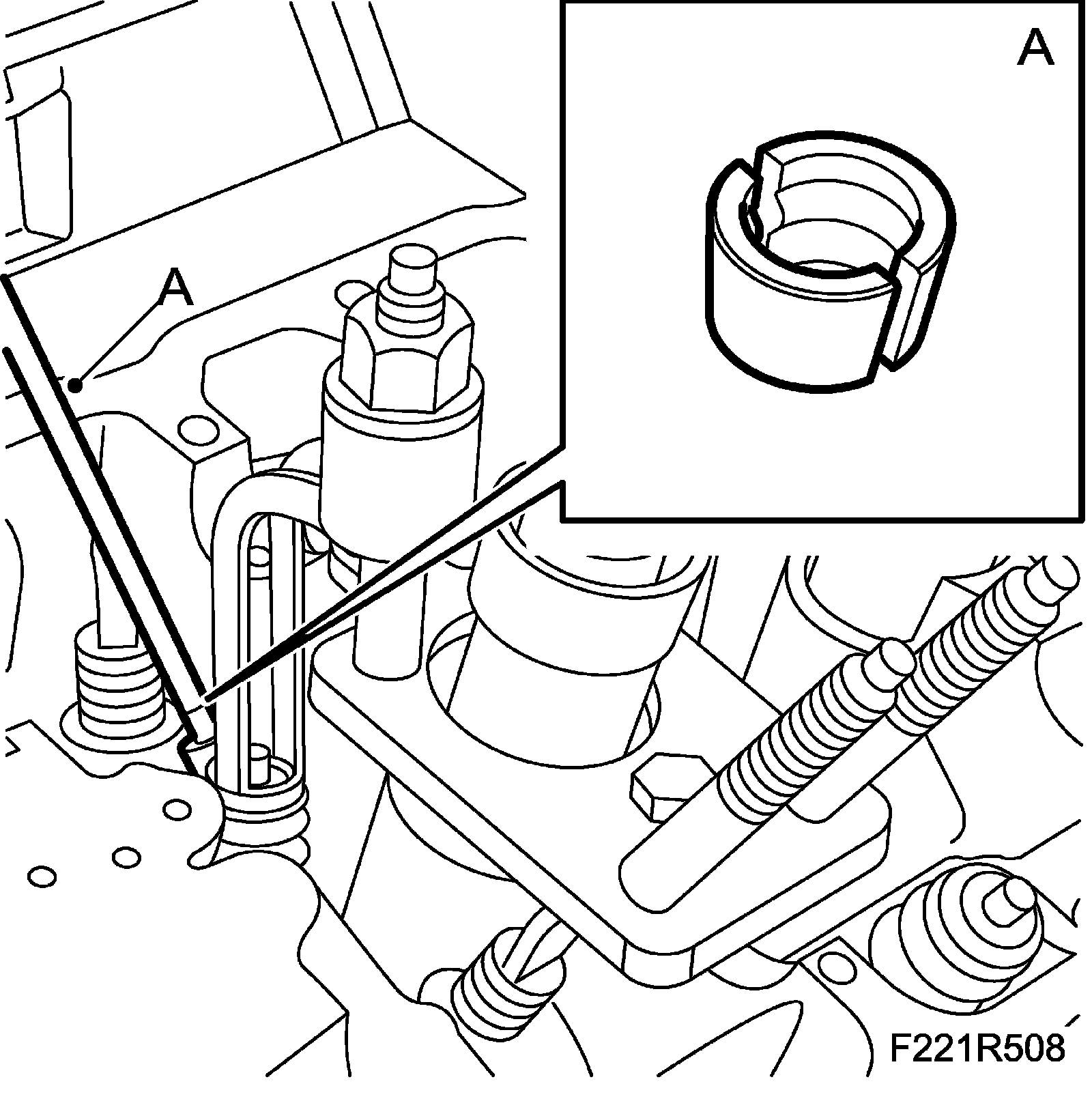 13. Fit the camshaft solenoid valve (695F) using a new seal (B).