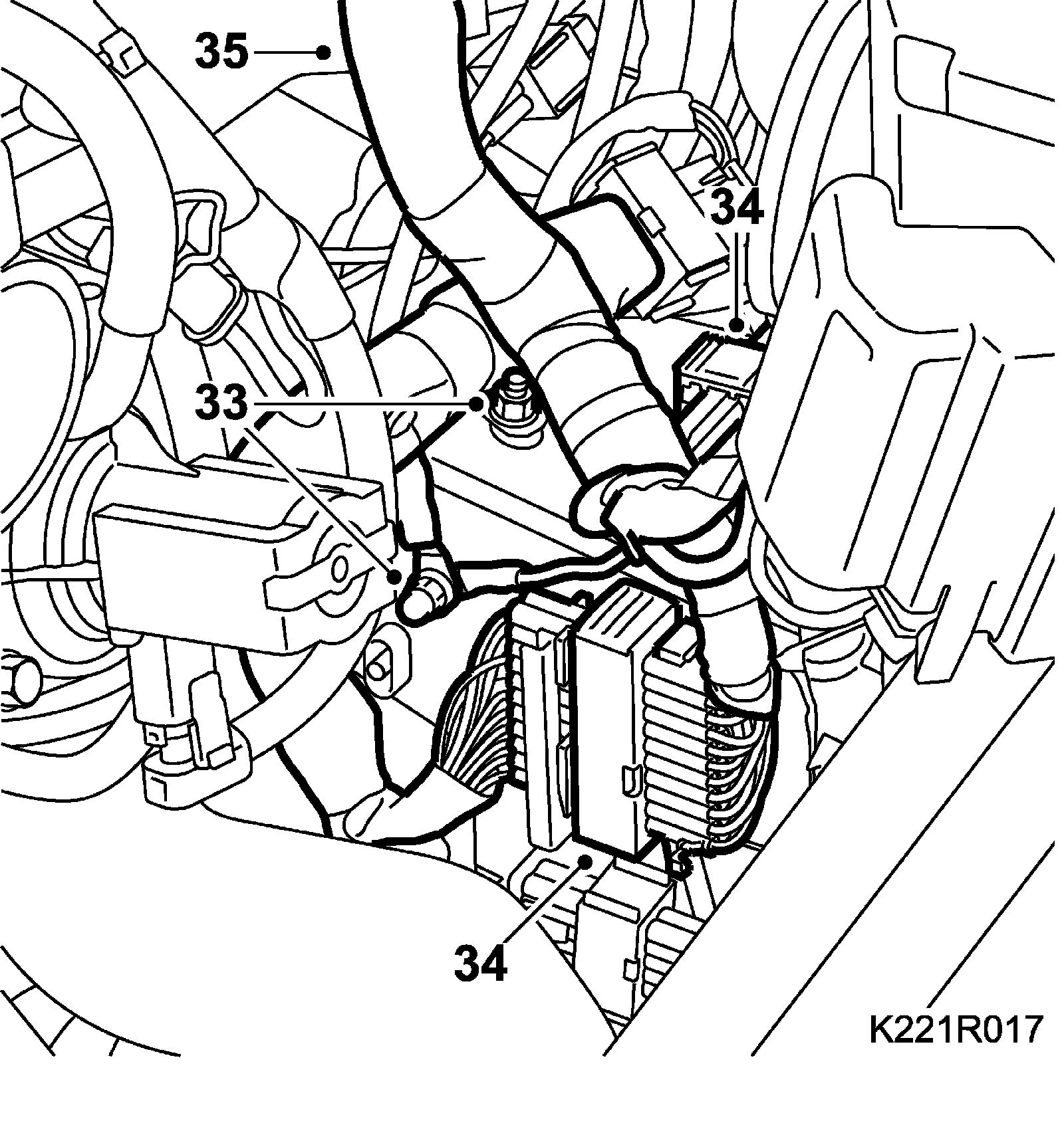 33. Remove the engine harness clamp from the body and detach the ground cables.