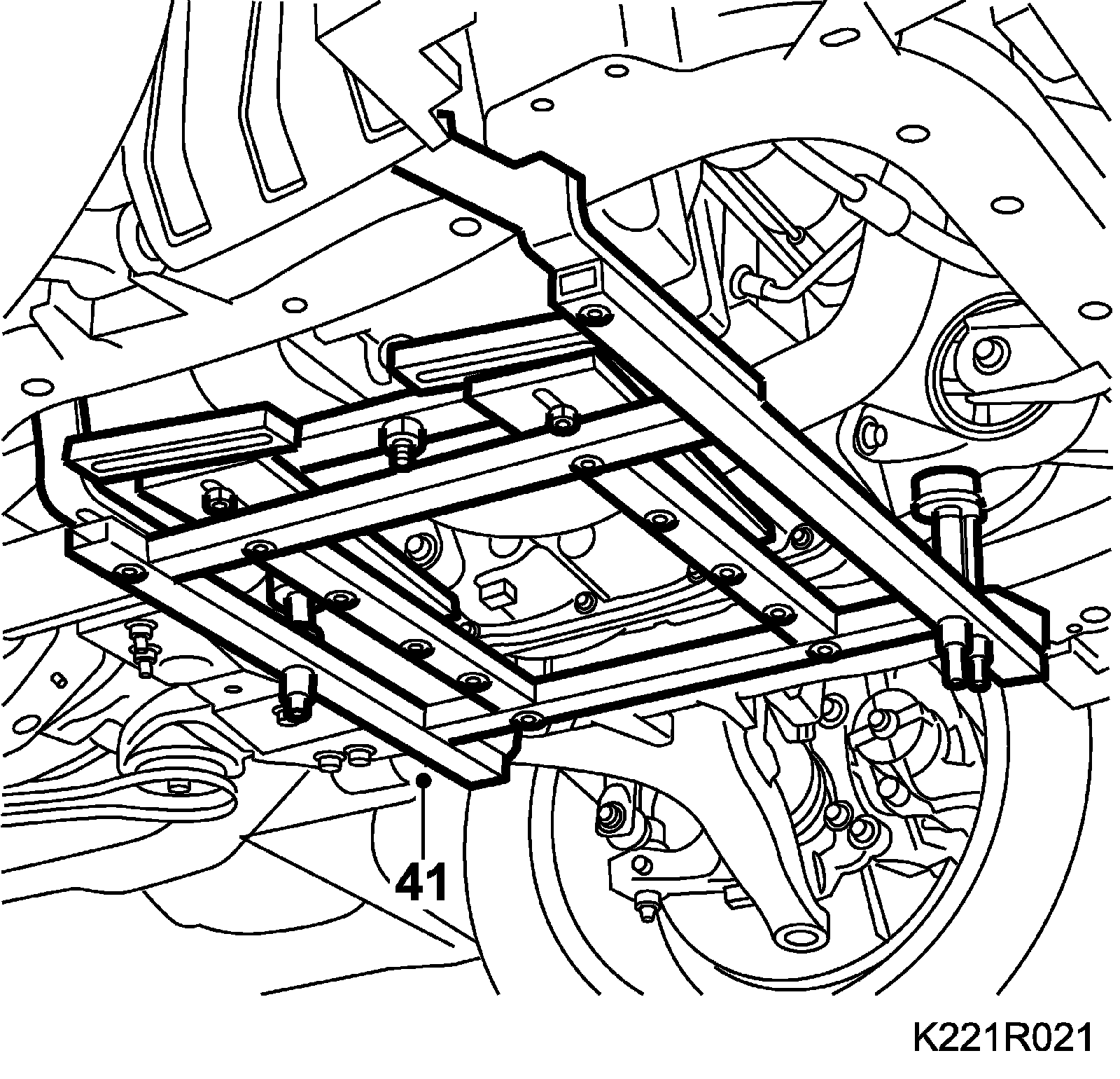 41. Fit KM-6313 centering tool, subframe - engine power train using the following tool: KM-6313-200 Support. Adjust the tool approx. 10 mm to the subframe to relieve some of the load on the engine mountings.