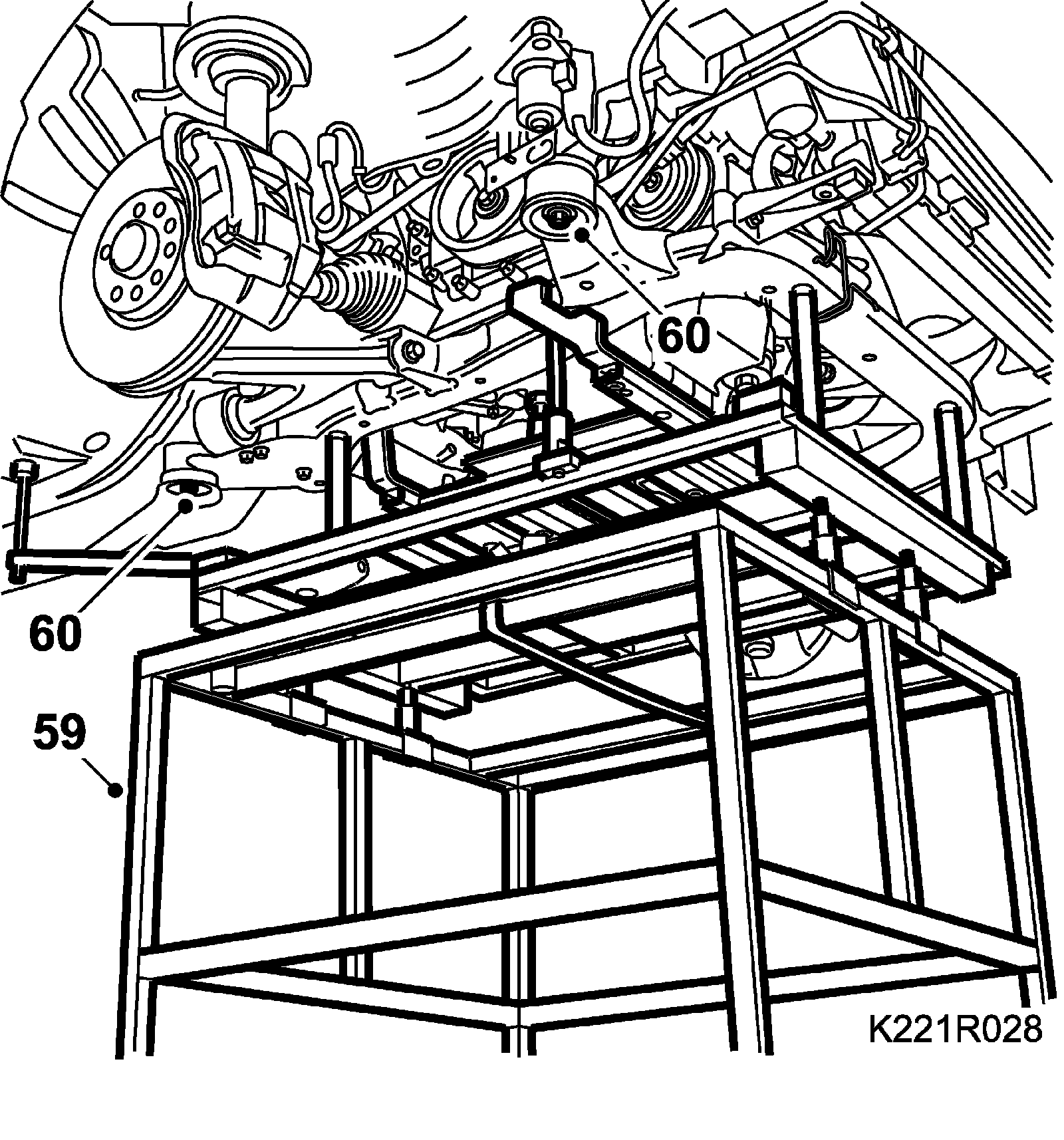 59. Position the trolley lift; raise and insert the guide pins in the subframe reference holes. Adjust the lifting pillars with the height adjusters, part no. 83 95 170, so that they rest evenly on the subframe. Check with the body guide pins that the subframe is positioned correctly in relation to the body.