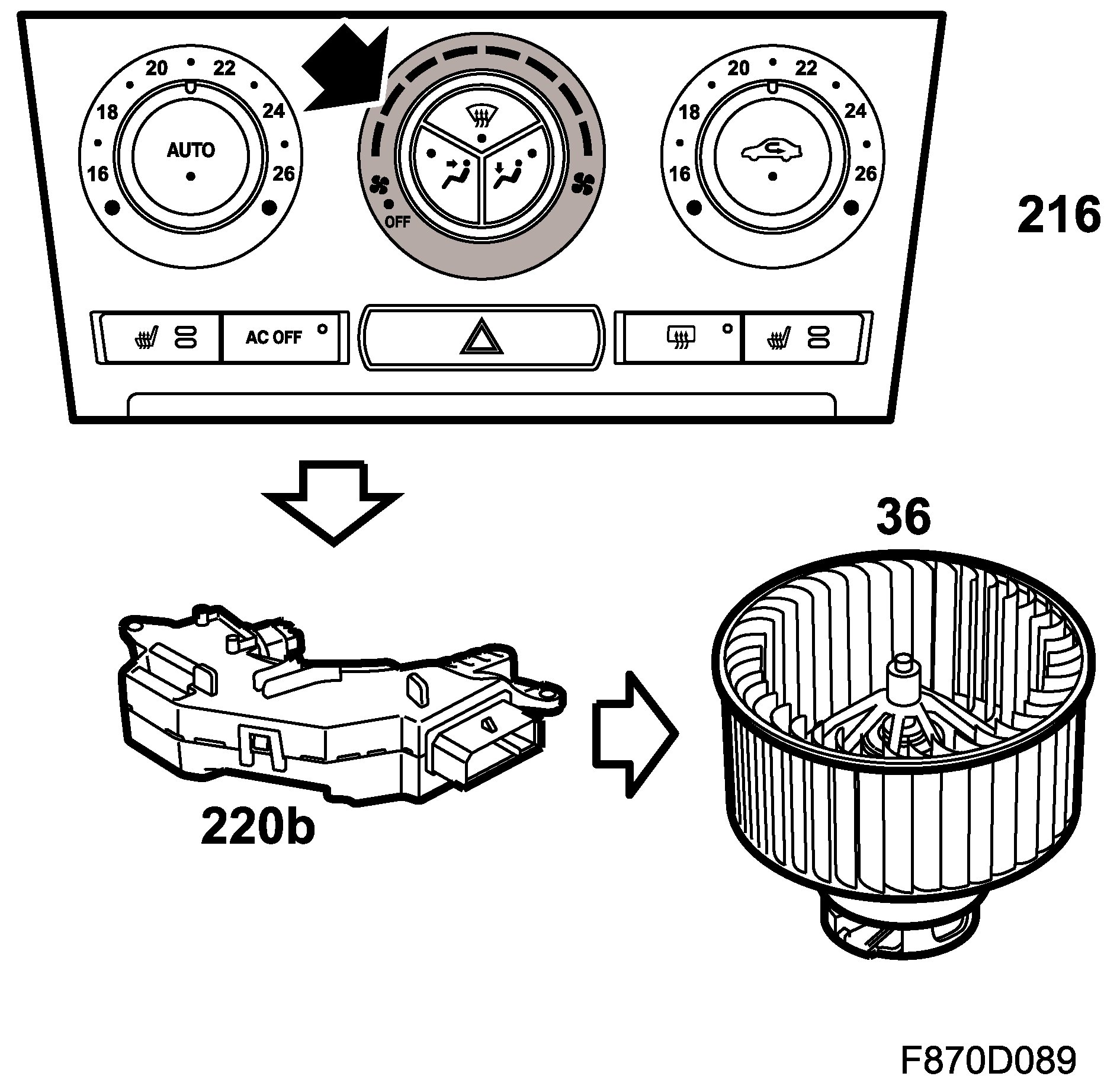 The control module adjusts cabin temperature with one stepping motor for the driver zone and one stepping motor for the passenger zone. The stepping motors are connected to dampers which mix warm and cool air.