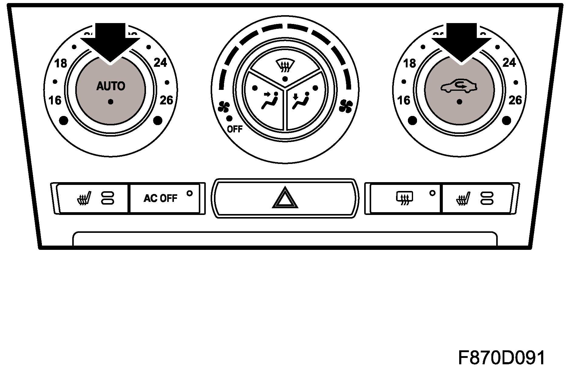 Selection of interior temperature for the driver and passenger zone in increments of 1 degrees C between 16 degrees C and 27 degrees C (or between 60 degrees F and 80 degrees F). An indicator LED in the temperature knob indicates the selected temperature.