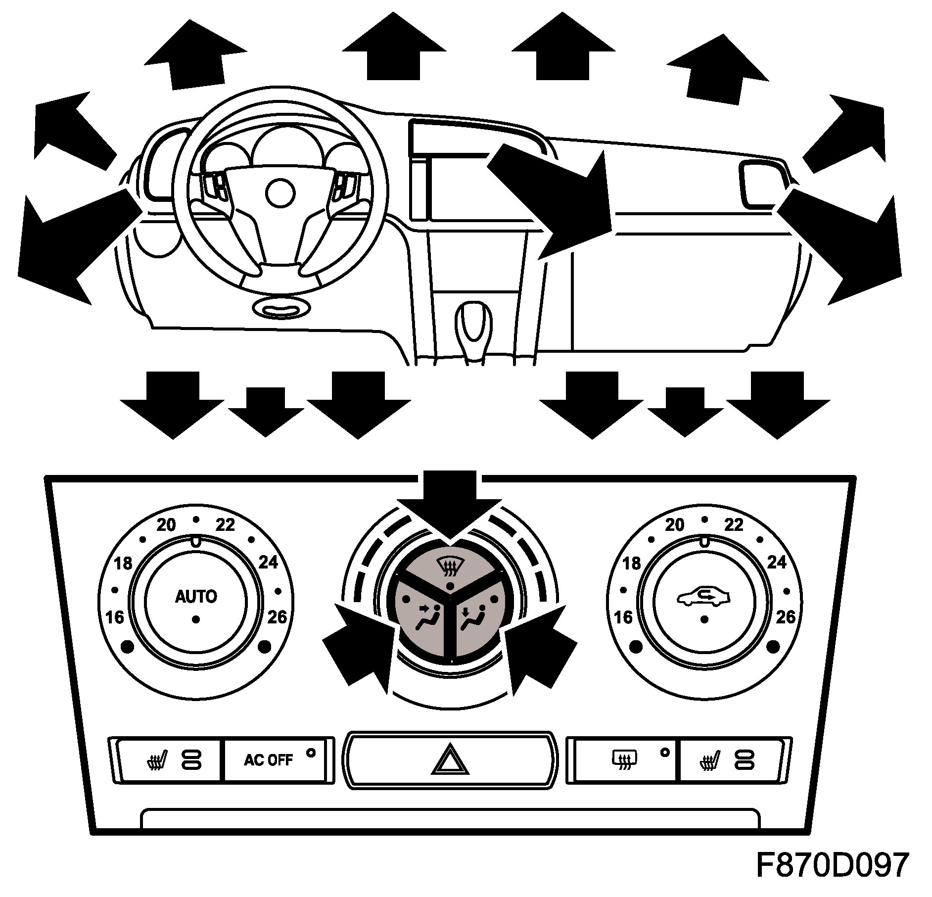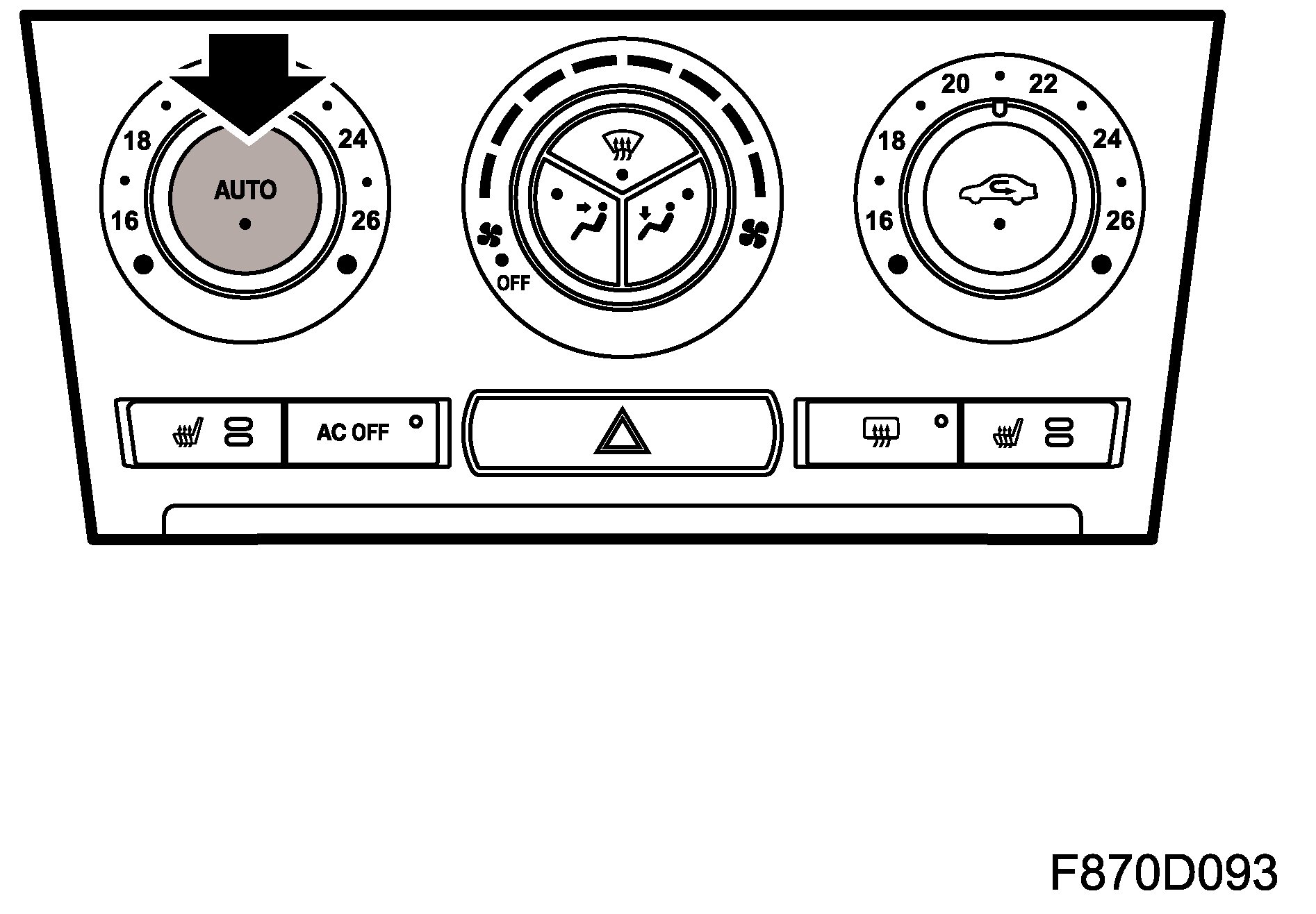 All functions are automatically regulated to the set temperature. The LED in the AUTO button illuminates and confirms that the AUTO function is active. AC OFF, electrically heated rear window, recirculation, heated seats and temperature up or down can be selected without AUTO being deactivated.