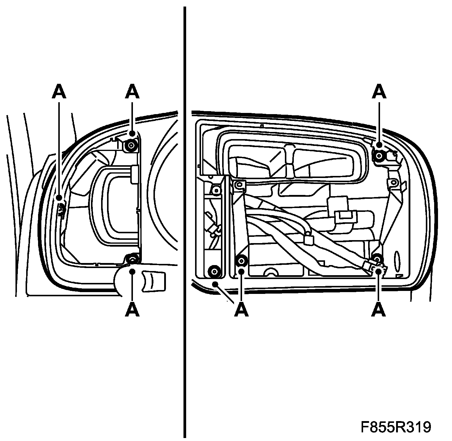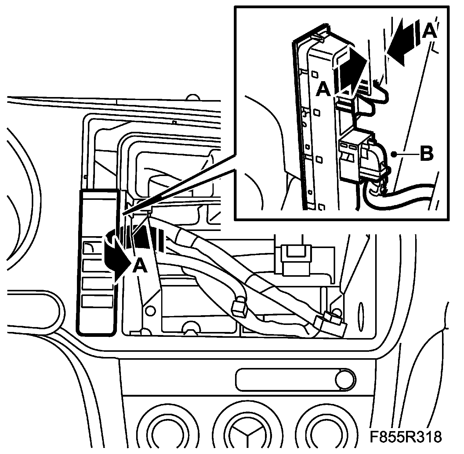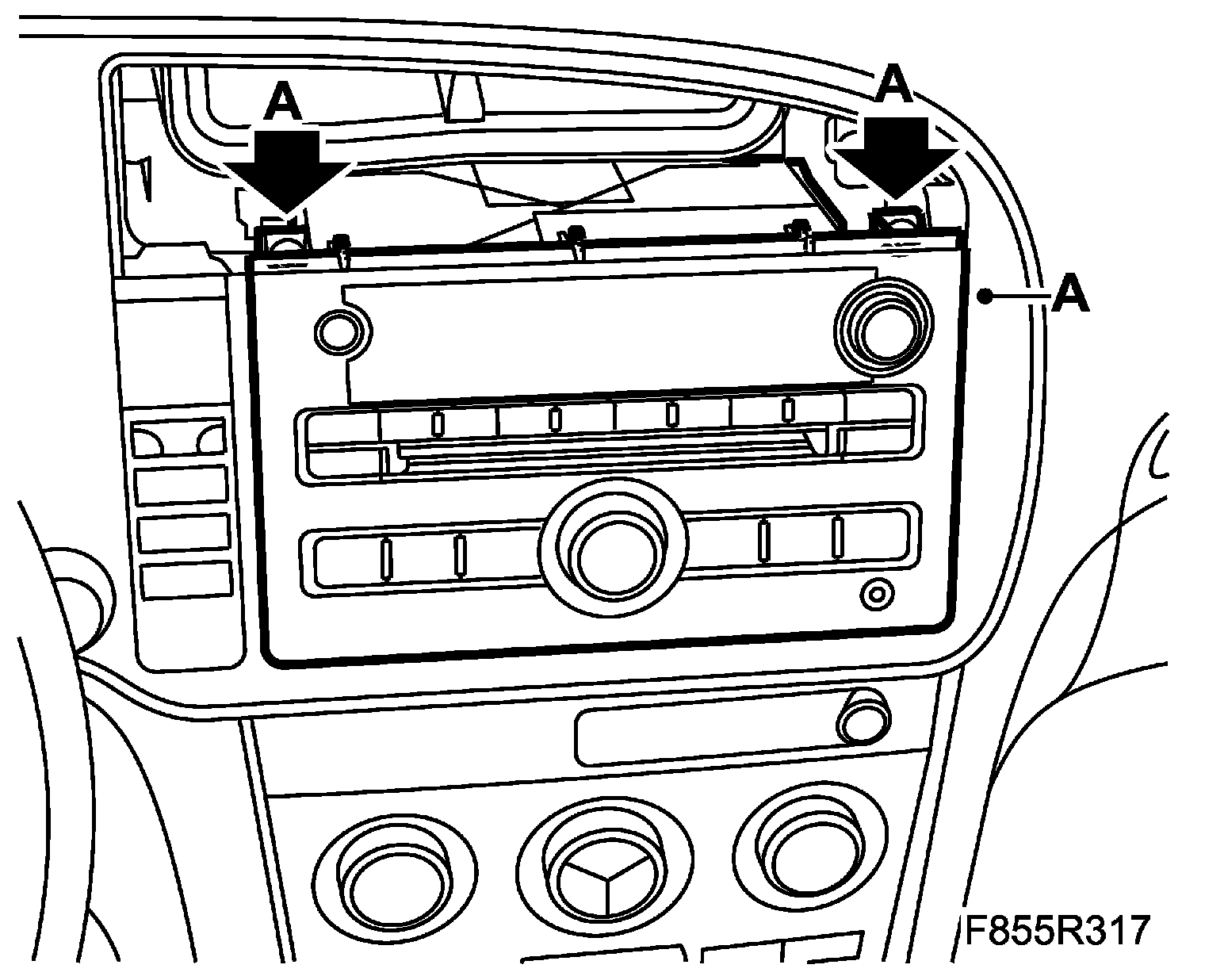 2. Remove the radio/navigation unit bolts (A). Raise the unit upwards/outwards.