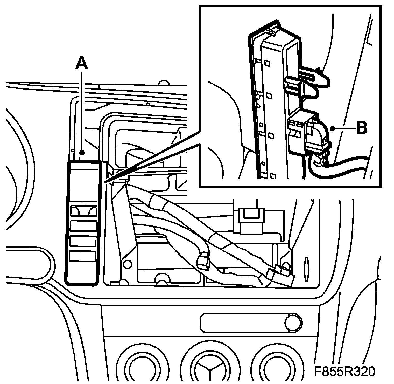 3. Remove the switch panel (A) by pressing the two tabs on the back together and the pressing the switch panel forward starting at its top edge. Unplug the connector (B).