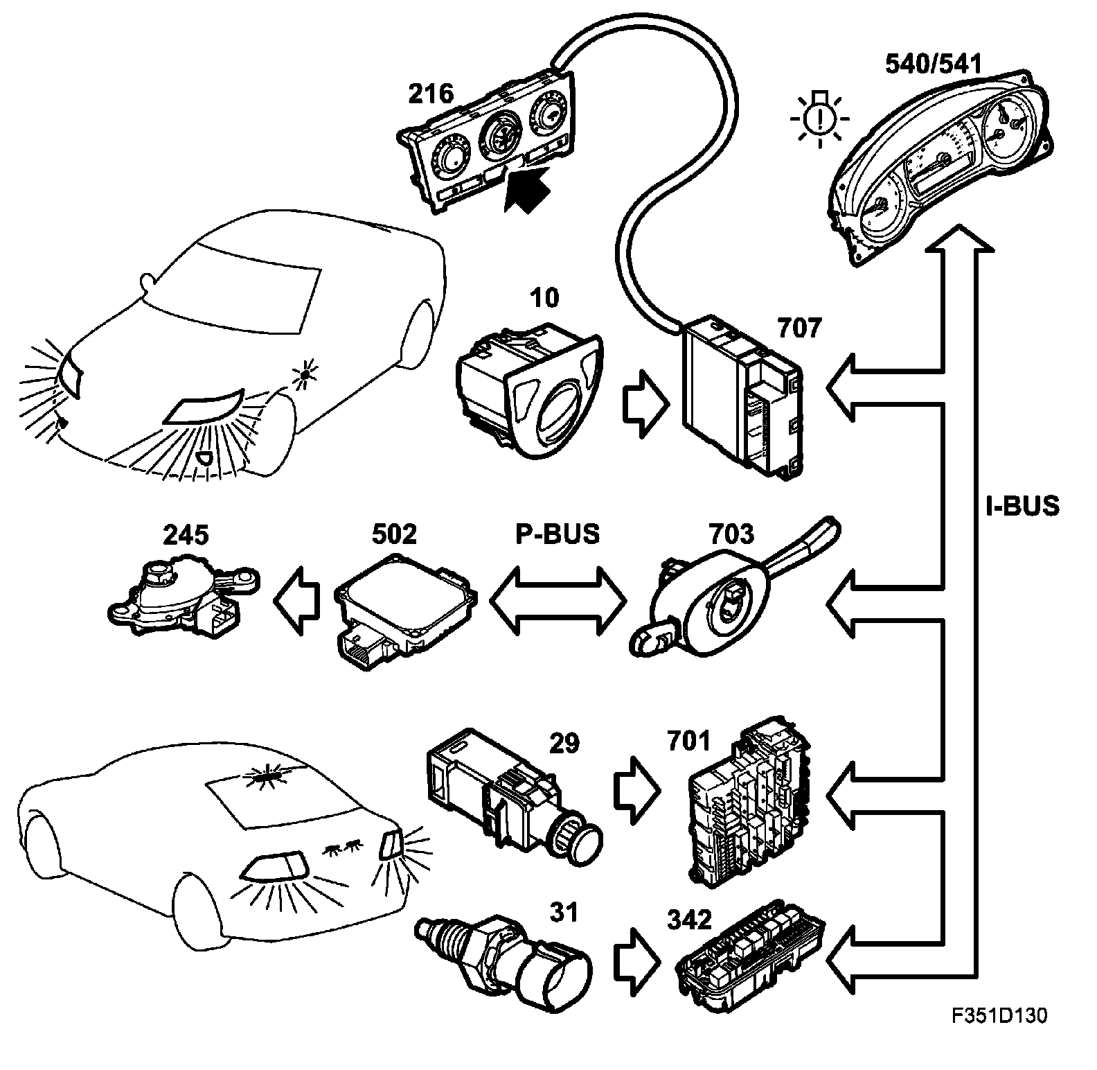 Main and dipped beam, tail lights, number plate lighting and parking lights are part of the main lighting. For the headlamps to be active, the light switch must be in position 2 and the ignition must be switched ON. Main/dipped beam and parking lights are controlled by the underhood electrical center. With dipped beam, the Xenon lamps and parking lights shine. With main beam, the H7 halogen lamp also shines. Once switched on, the Xenon lamp always shines at the same power. For main beam, the shutter is completely down. For dipped beam, the Xenon lamp is partially screened. The halogen lamp and Xenon lamp shine together for main beam.