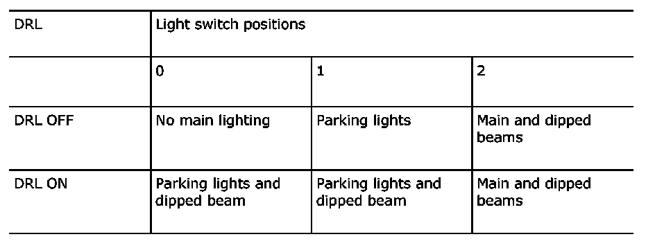DRL can be adjusted (ON/OFF) using the diagnostic tool. If the value is set to ON, dipped beam will come on when the light switch (10) is in position 0. If the value is set to OFF, neither parking lights nor dipped beam will come on when the light switch (10) is in position 0.