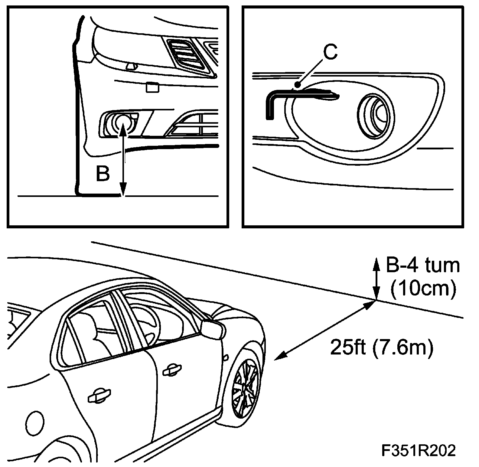 2. Measure from the ground to the center of the fog light lens (B), subtract 4 inches (10 cm) and note the measurement.