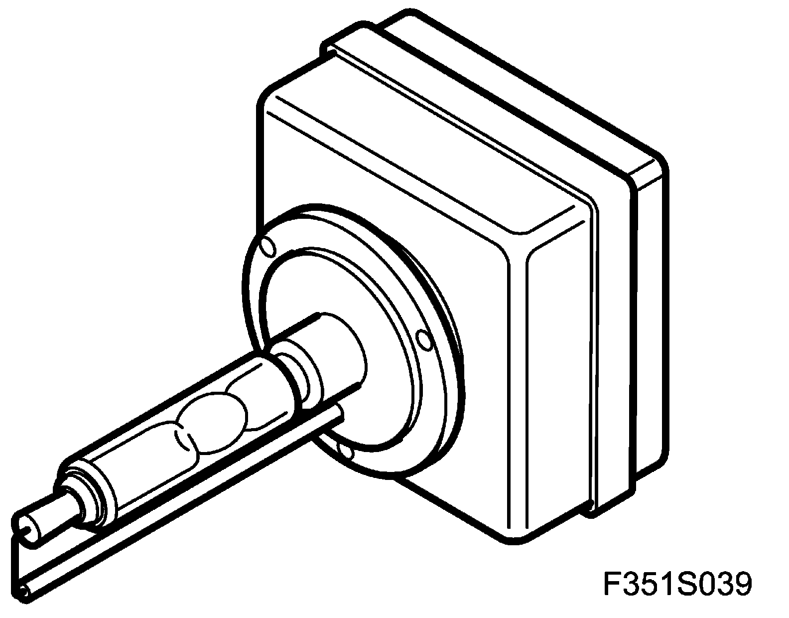 The Xenon bulb is of type D1S with an output of 35 W. The bulb and ignition transformer form a single unit. The Xenon bulb is a gas discharge bulb and therefore has no filament. Light is produced by a plasma discharge between two electrodes. The distance between the electrodes is 4.2 mm. The electrodes are mounted in a capsule (igniter). The igniter contains the inert gas as well as other substances such as mercury and thallium. It is in this gas mixture that discharge occurs, under high pressure and high temperature.