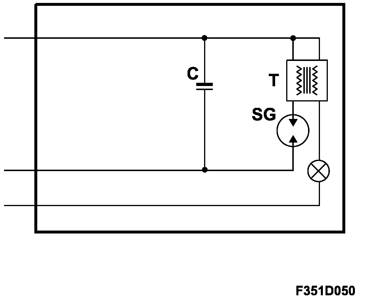 When the ballast is supplied B+ on pin 1, the ignition procedure starts. The ballast produces a charge voltage of max. 1100 V (normal charge voltage is 550 V) in a DC converter (12/1100 V). This voltage is conducted to the igniter, + 550 V pin 3 of the ballast, to pin 4 of the igniter. The charge voltage charges a capacitor (C) in the igniter. In this manner energy is stored to produce an ignition impulse. Voltage over the capacitor now rises until the spark gap (SG) begins to conduct, which occurs at approx. 550 V. The energy stored in the capacitor is dumped to the transformer's (T) primary winding (P). Over the transformer's secondary winding, a high-voltage pulse is produced that can reach 30 kV (normally approx. 23 kV) to light the bulb.