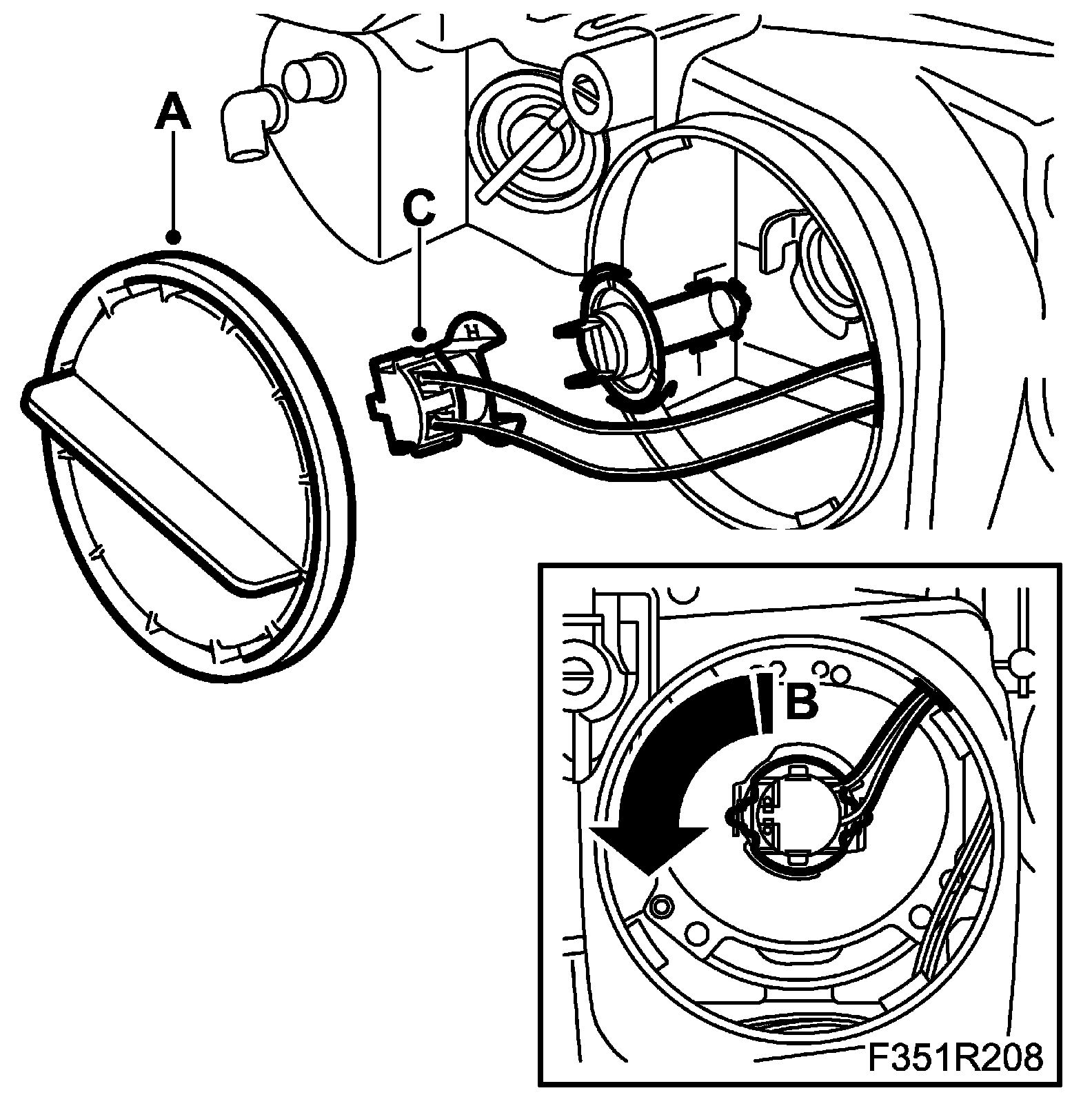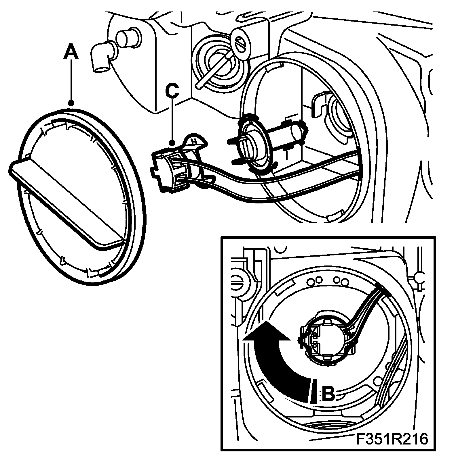 ^ Remove the bulb by turning it anticlockwise (B). Then lift the bulb straight out of the headlamp.
