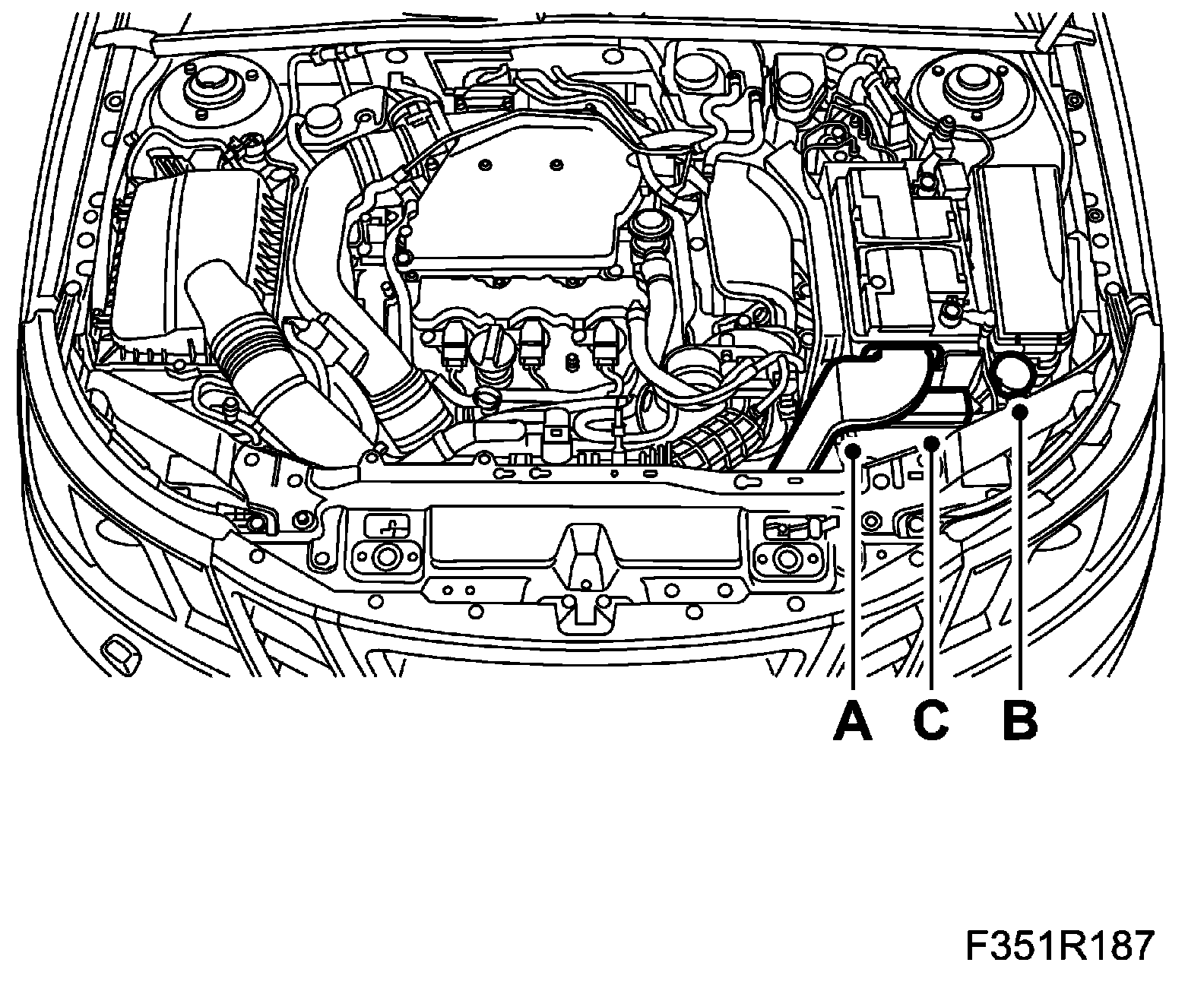 2. LH: Remove the battery cover, air inlet pipe (A), washer fluid filler pipe (B) and the main fuse box (C).