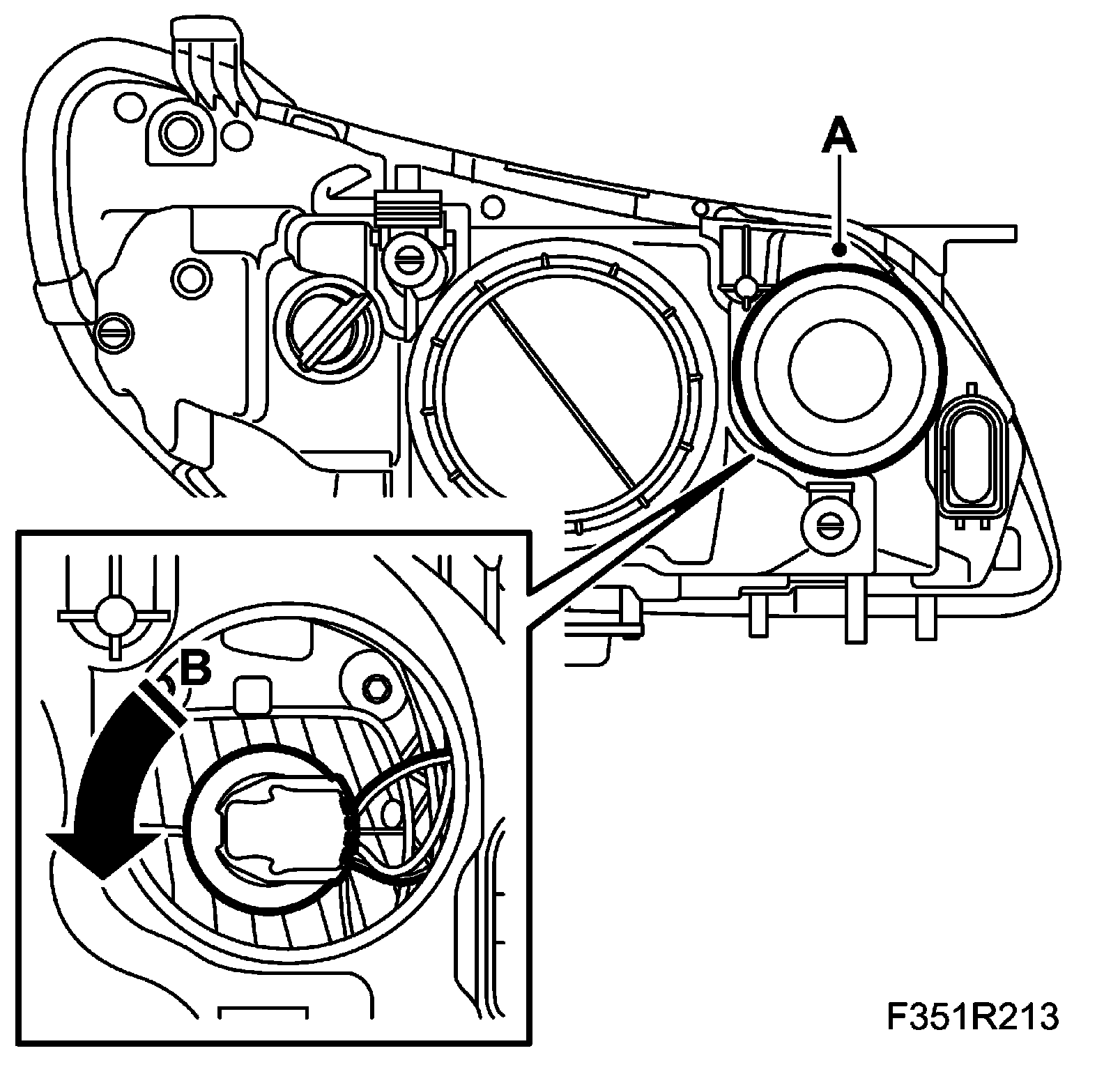 ^ Remove the cover (A) and turn the bulb socket anticlockwise (B). Lift out the bulb socket.