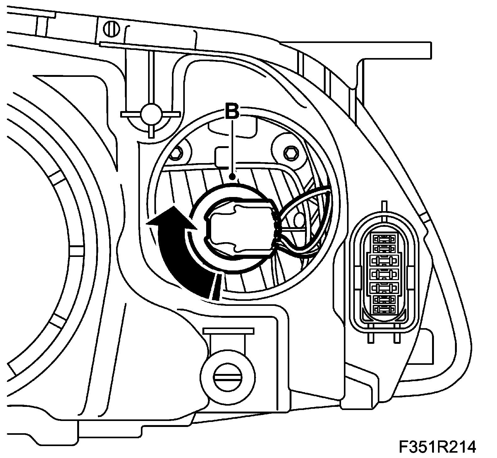 ^ Fit the bulb socket in the headlamp by positioning it at its recess (note the guide groove). Turn the bulb socket clockwise (B) and fit the cover.